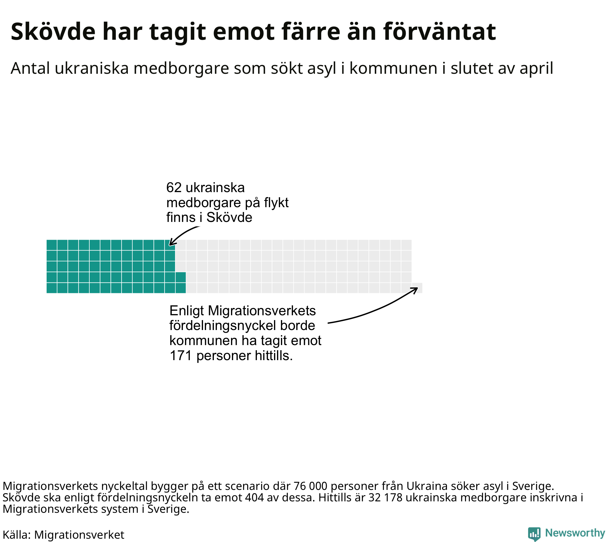 Fördelningsförslaget utgår från en tidigare prognos där 76 000 skyddssökande från Ukriana väntades under första halvåret. I den fördelningen ska Skövde ta emot 404 av de 76 000. Vid samma fördelning borde Skövde ha tagit emot 171 av de som anlänt hittills – kommunen har alltså tagit emot 109 färre ukrainska medborgare än förväntat.