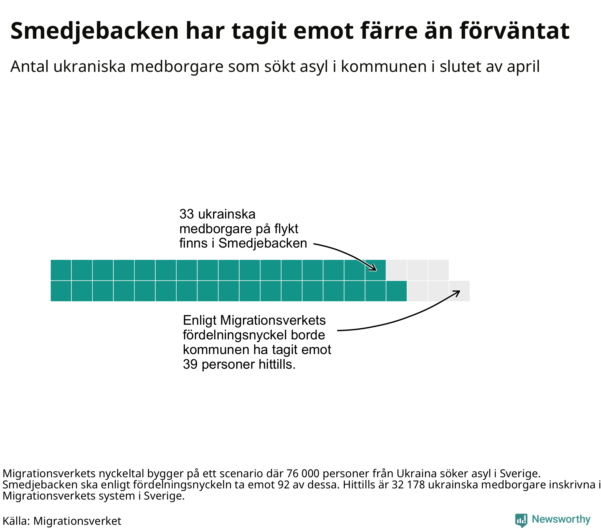 Fördelningsförslaget utgår från en tidigare prognos där 76 000 skyddssökande från Ukriana väntades under första halvåret. I den fördelningen ska Smedjebacken ta emot 92 av de 76 000. Vid samma fördelning borde Smedjebacken ha tagit emot 39 av de som anlänt hittills – kommunen har alltså tagit emot sex färre ukrainska medborgare än förväntat.