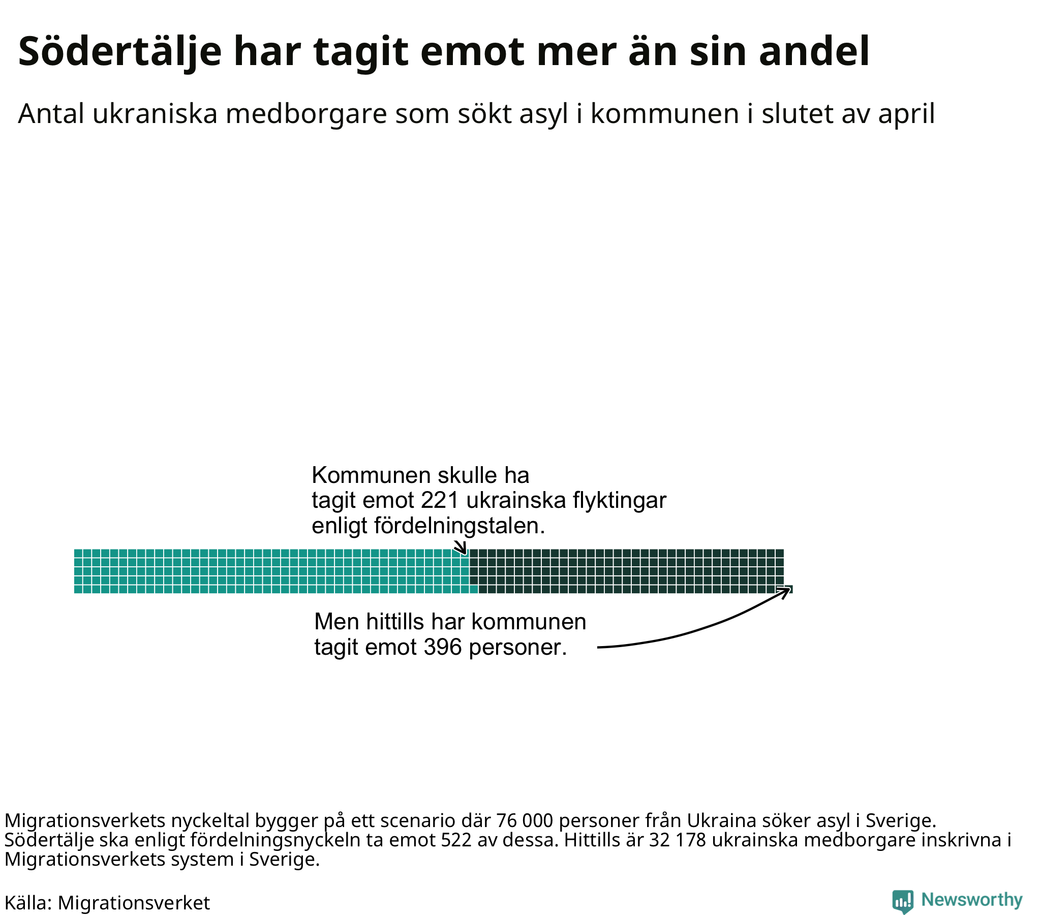 Enligt UNHCR har 5,9 miljoner människor hittills flytt från Ukraina sedan Rysslands anfall i slutet av februari. Ungefär 36 000 av dem har kommit till Sverige – och av dem som nu finns i det svenska systemet finns 396 personer i Södertälje kommun. Det motsvarar fyra ukrainska flyktingar per 1 000 invånare, vilket placerar kommunen bland den tredjedel som hittills tagit emot flest. Flest i landet, sett till befolkning, har Högsby kommun tagit emot: 160 personer – eller 28 per 1 000 invånare.