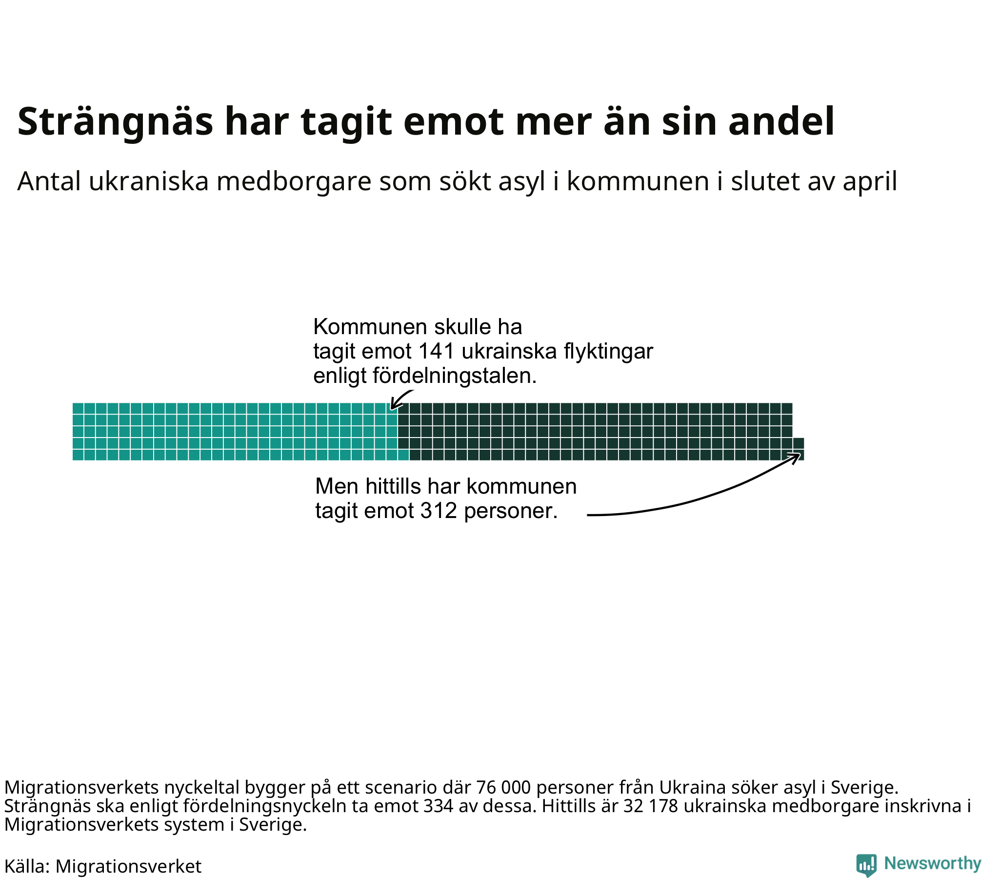 Fördelningsförslaget utgår från en tidigare prognos där 76 000 skyddssökande från Ukriana väntades under första halvåret. I den fördelningen ska Strängnäs ta emot 334 av de 76 000. Vid samma fördelning borde Strängnäs ha tagit emot 141 av de som anlänt hittills – kommunen har alltså tagit emot 171 fler ukrainska medborgare än förväntat.