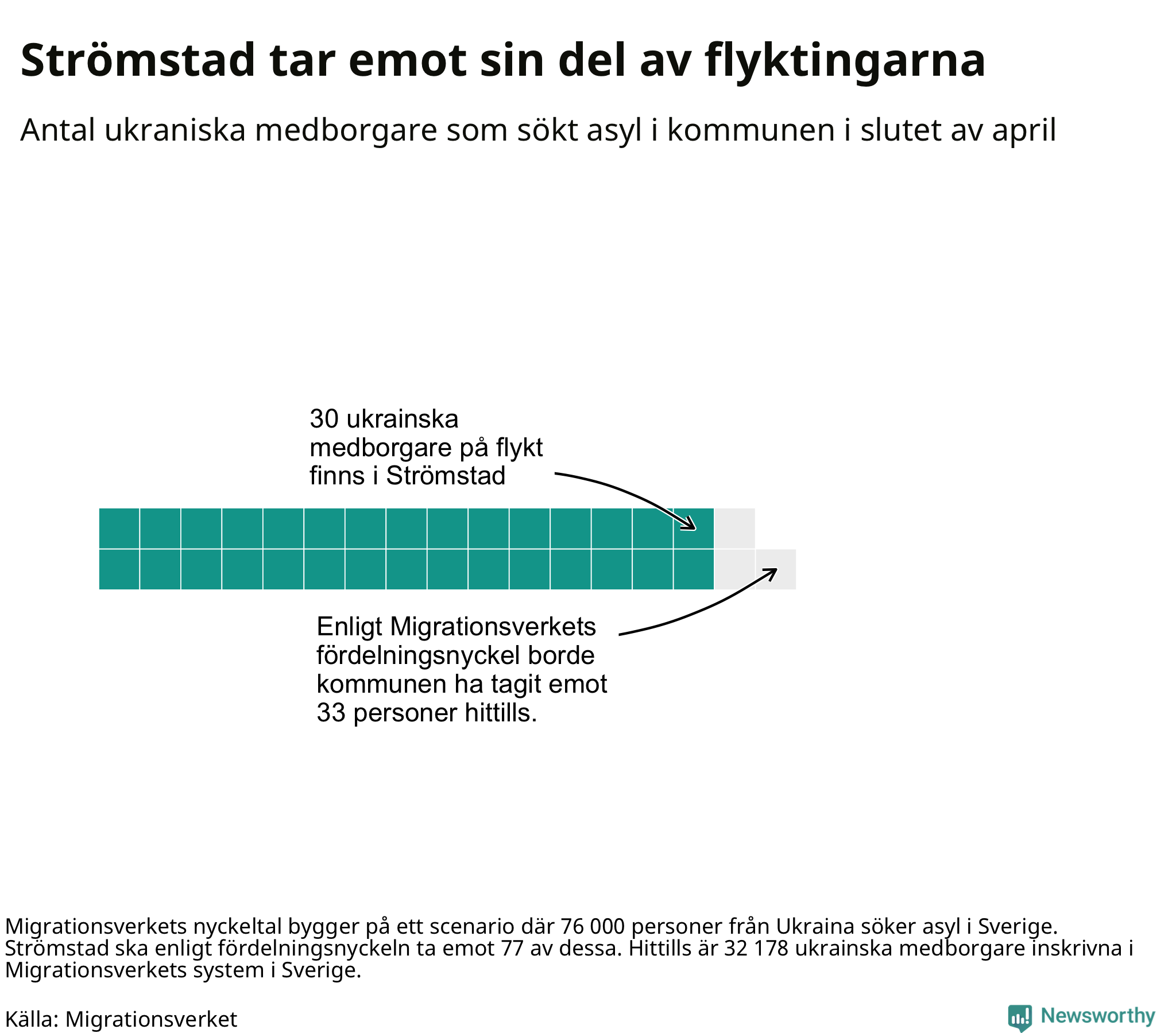 Fördelningsförslaget utgår från en tidigare prognos där 76 000 skyddssökande från Ukriana väntades under första halvåret. I den fördelningen ska Strömstad ta emot 77 av de 76 000. Vid samma fördelning borde Strömstad ha tagit emot 33 av de som anlänt hittills – kommunen har alltså tagit emot tre färre ukrainska medborgare än förväntat.