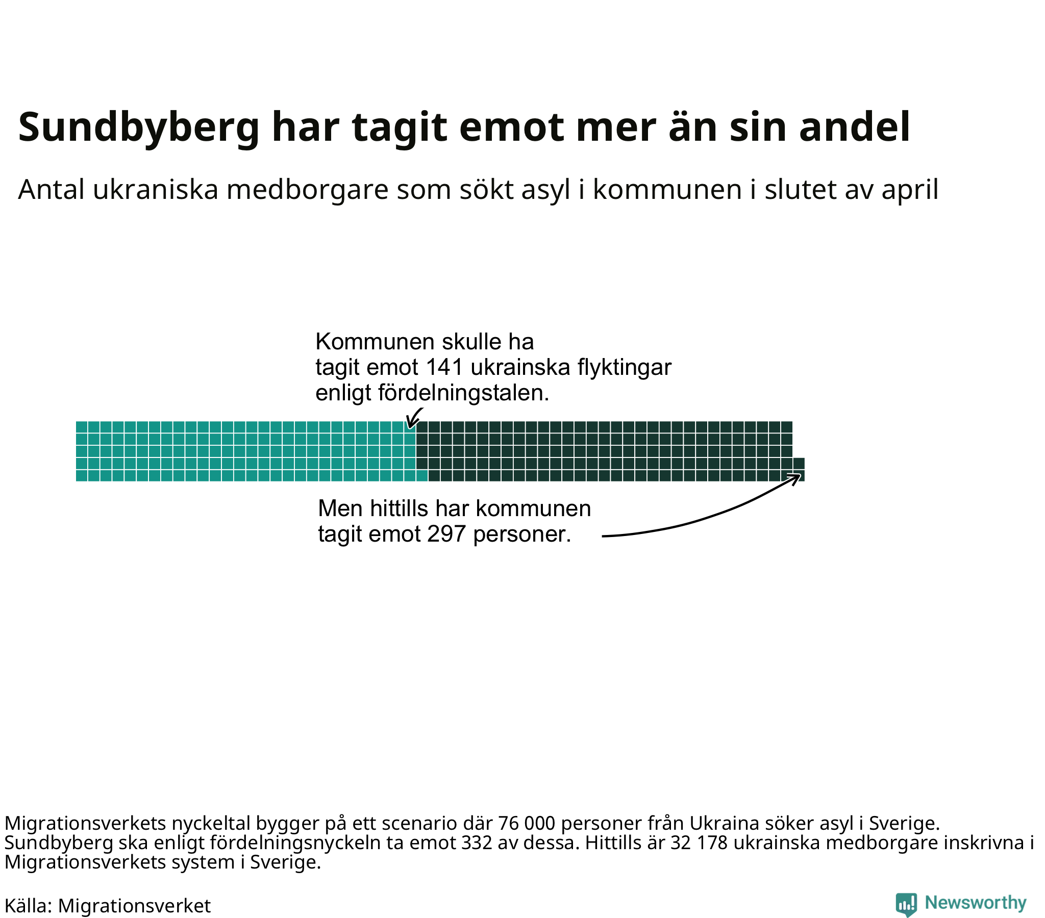 Fördelningsförslaget utgår från en tidigare prognos där 76 000 skyddssökande från Ukriana väntades under första halvåret. I den fördelningen ska Sundbyberg ta emot 332 av de 76 000. Vid samma fördelning borde Sundbyberg ha tagit emot 141 av de som anlänt hittills – kommunen har alltså tagit emot 156 fler ukrainska medborgare än förväntat.
