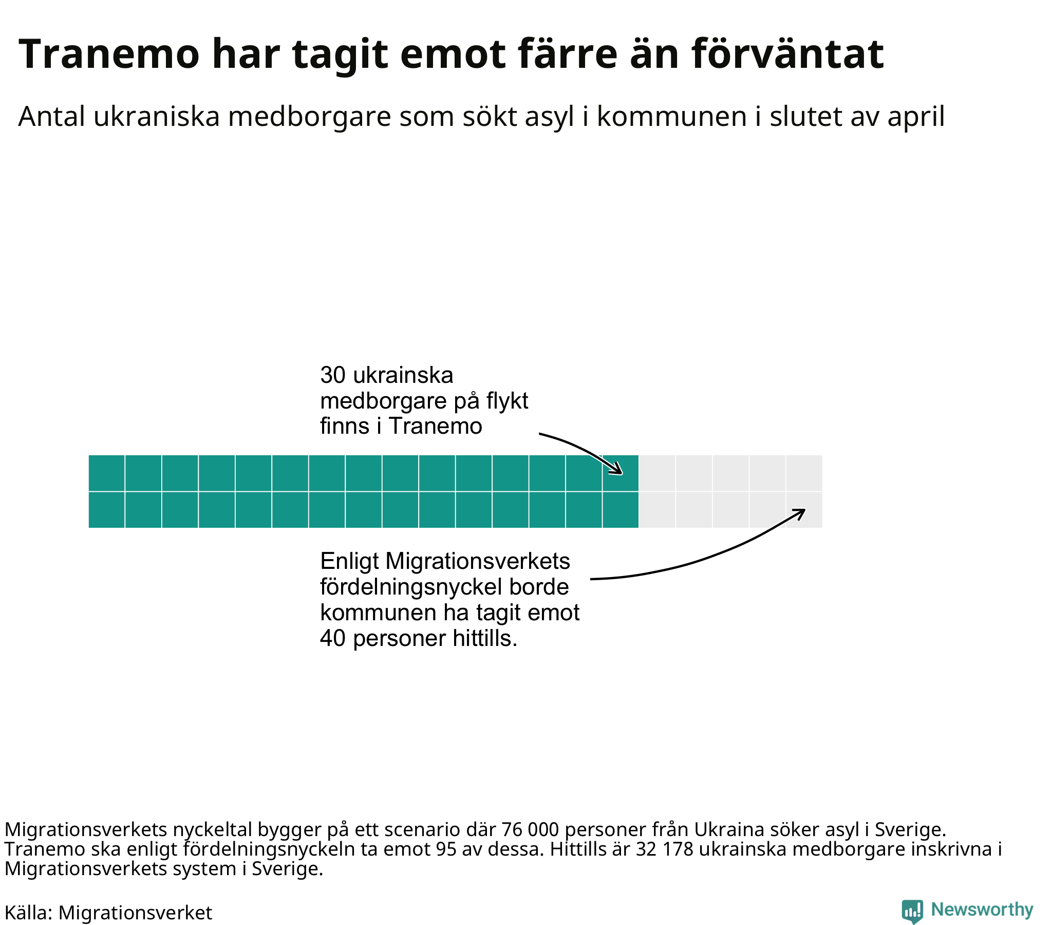 Fördelningsförslaget utgår från en tidigare prognos där 76 000 skyddssökande från Ukriana väntades under första halvåret. I den fördelningen ska Tranemo ta emot 95 av de 76 000. Vid samma fördelning borde Tranemo ha tagit emot 40 av de som anlänt hittills – kommunen har alltså tagit emot tio färre ukrainska medborgare än förväntat.