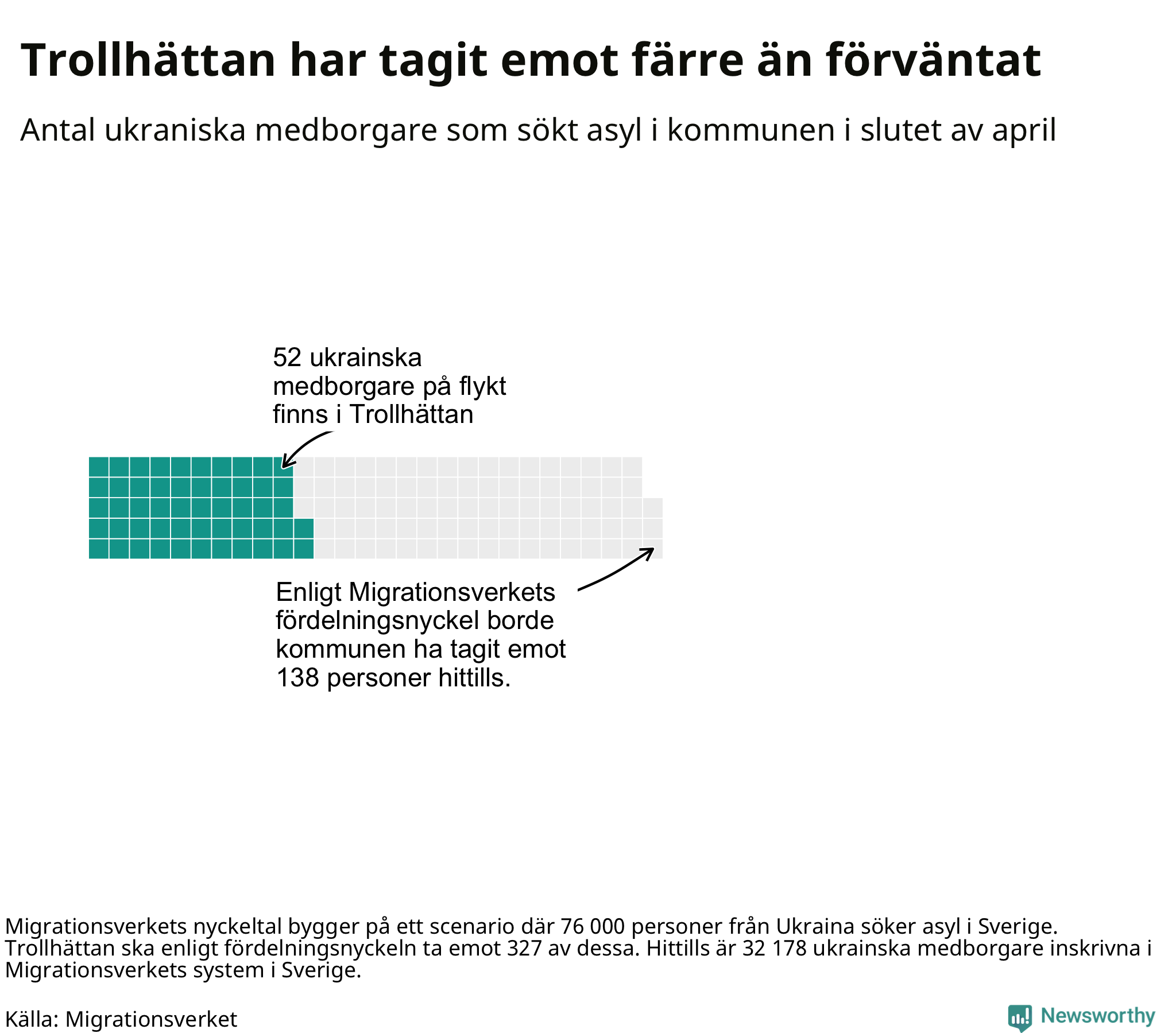 Fördelningsförslaget utgår från en tidigare prognos där 76 000 skyddssökande från Ukriana väntades under första halvåret. I den fördelningen ska Trollhättan ta emot 327 av de 76 000. Vid samma fördelning borde Trollhättan ha tagit emot 138 av de som anlänt hittills – kommunen har alltså tagit emot 86 färre ukrainska medborgare än förväntat.