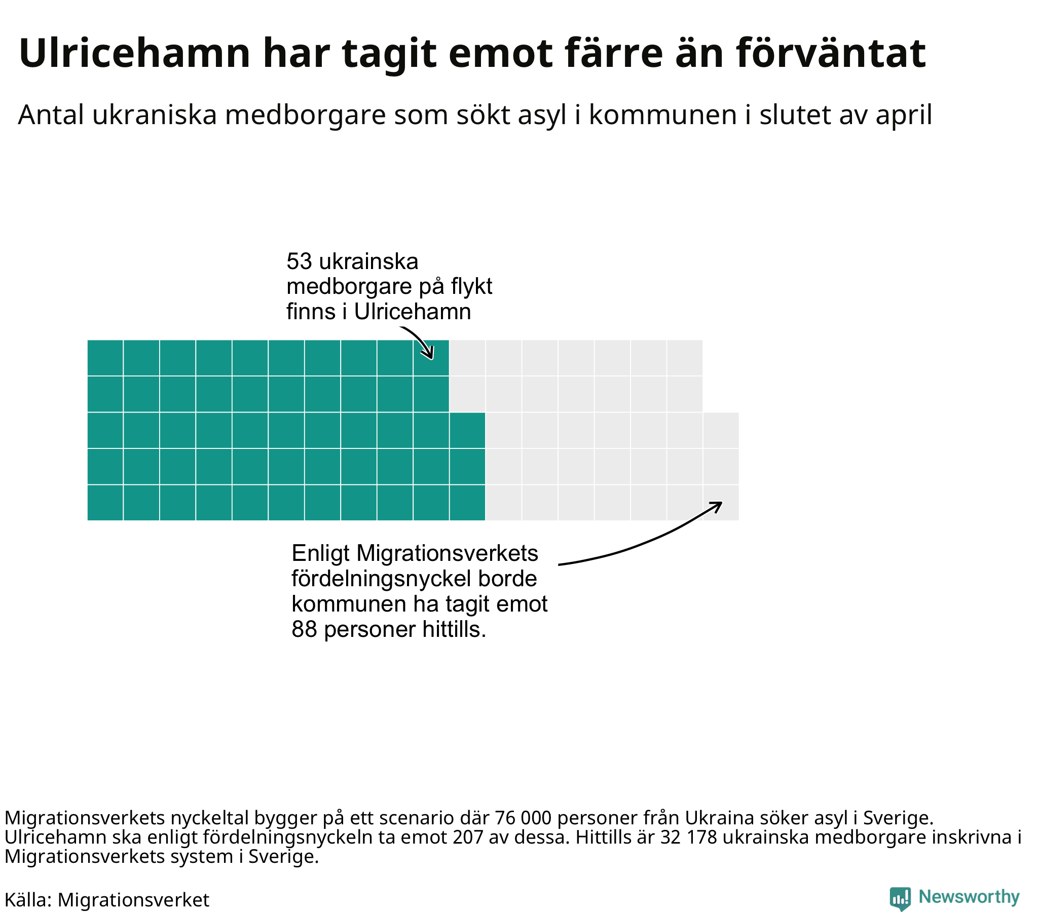 Fördelningsförslaget utgår från en tidigare prognos där 76 000 skyddssökande från Ukriana väntades under första halvåret. I den fördelningen ska Ulricehamn ta emot 207 av de 76 000. Vid samma fördelning borde Ulricehamn ha tagit emot 88 av de som anlänt hittills – kommunen har alltså tagit emot 35 färre ukrainska medborgare än förväntat.