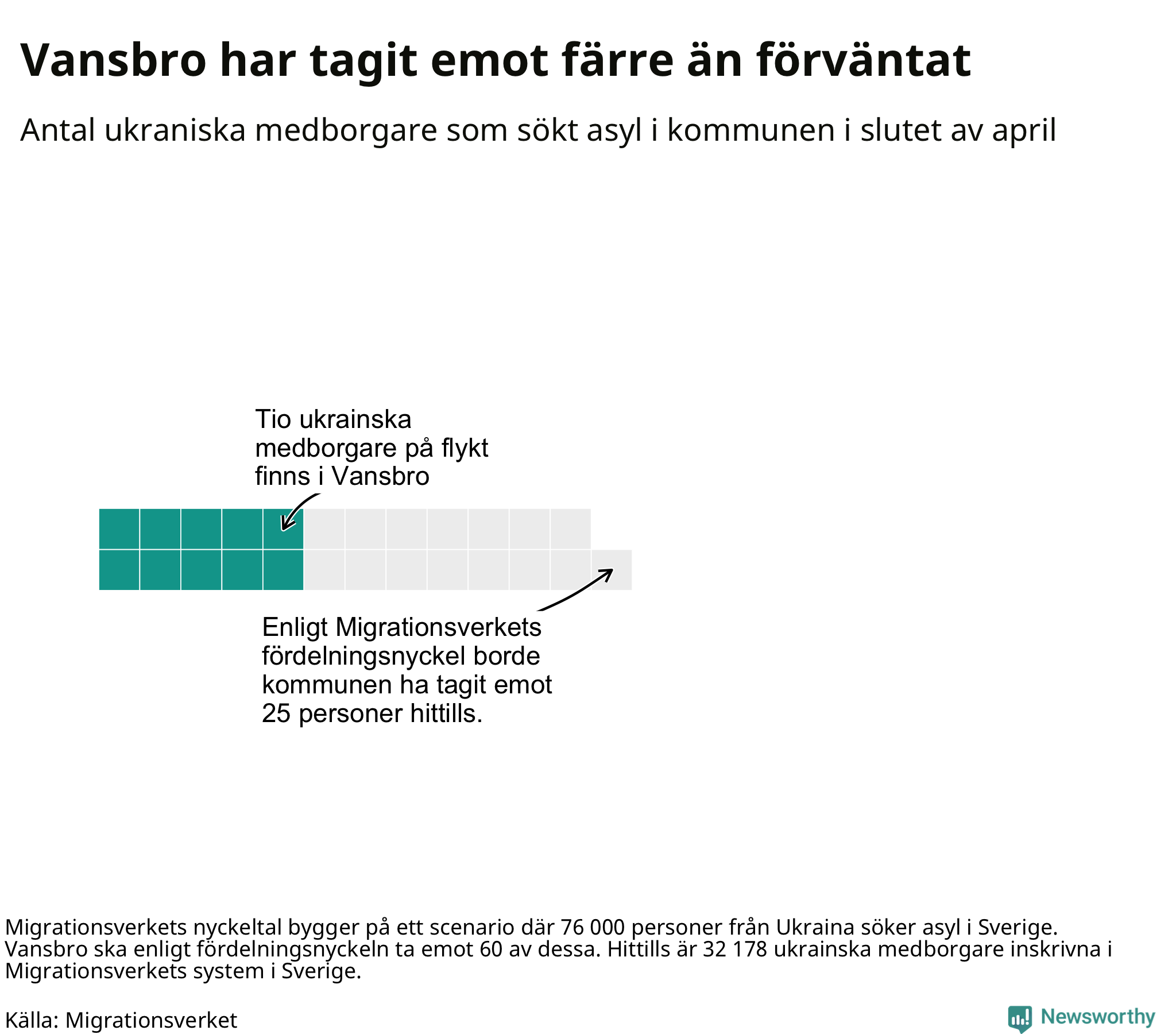 Fördelningsförslaget utgår från en tidigare prognos där 76 000 skyddssökande från Ukriana väntades under första halvåret. I den fördelningen ska Vansbro ta emot 60 av de 76 000. Vid samma fördelning borde Vansbro ha tagit emot 25 av de som anlänt hittills – kommunen har alltså tagit emot 15 färre ukrainska medborgare än förväntat.