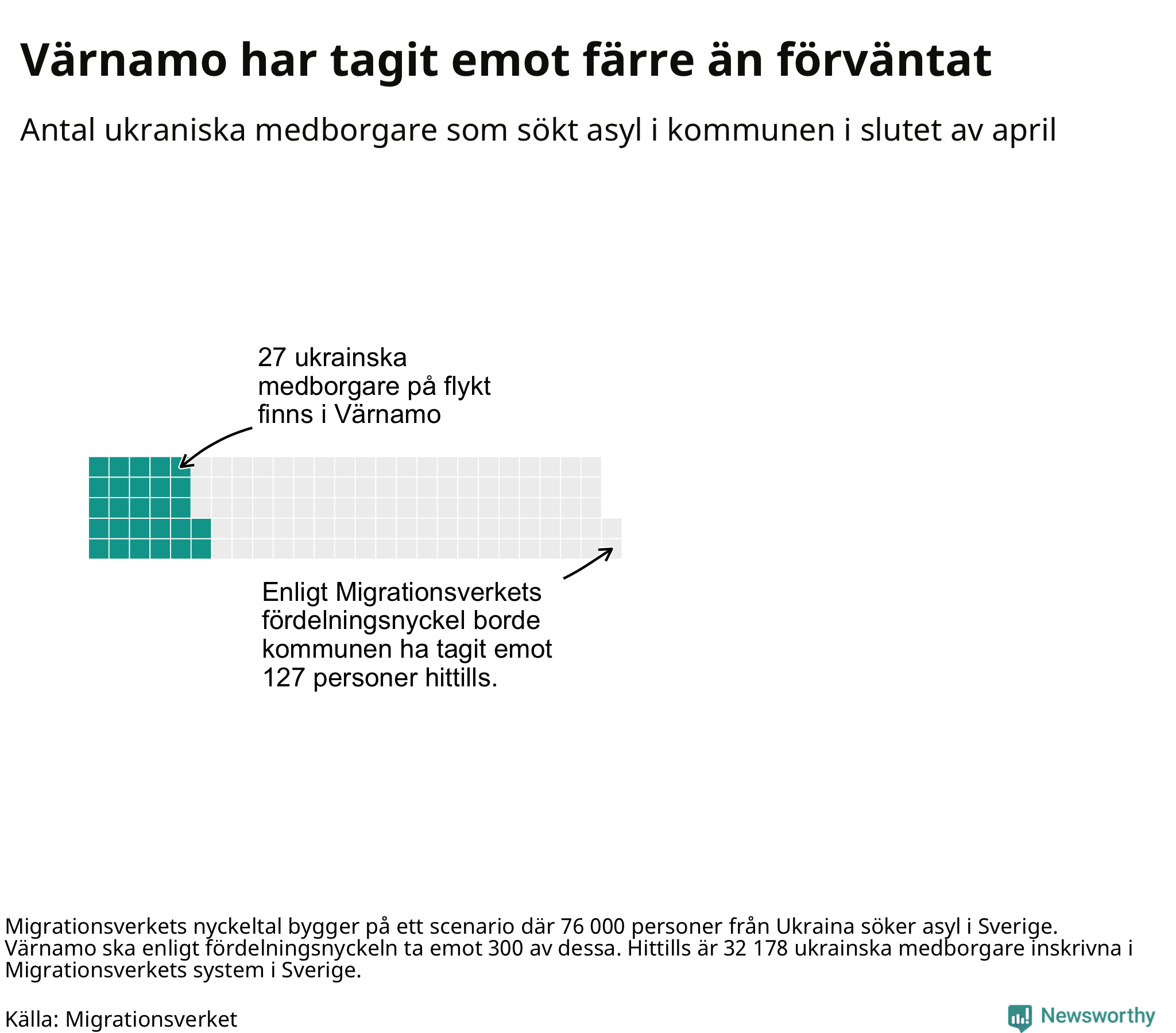 Fördelningsförslaget utgår från en tidigare prognos där 76 000 skyddssökande från Ukriana väntades under första halvåret. I den fördelningen ska Värnamo ta emot 300 av de 76 000. Vid samma fördelning borde Värnamo ha tagit emot 127 av de som anlänt hittills – kommunen har alltså tagit emot 100 färre ukrainska medborgare än förväntat.
