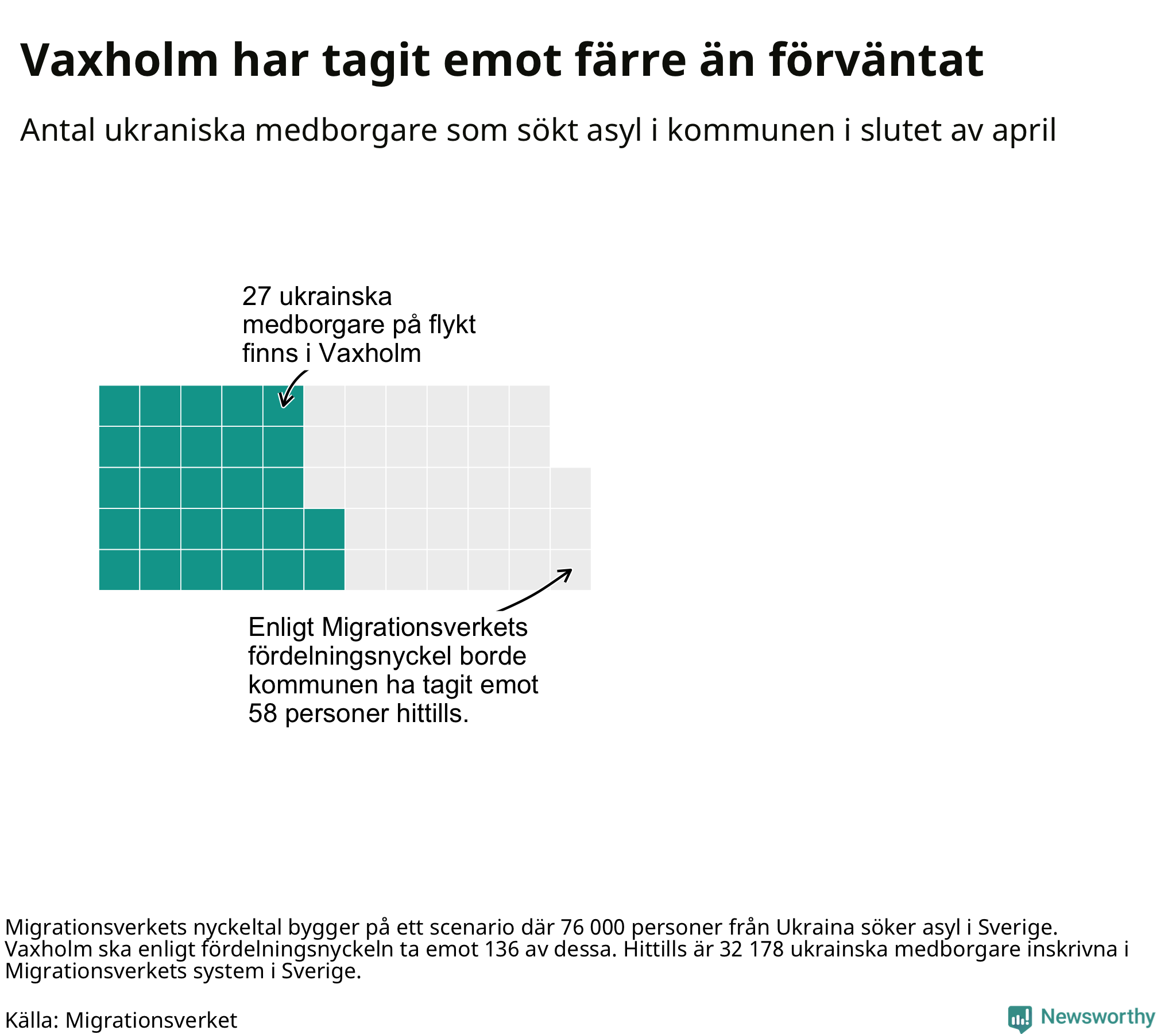 Fördelningsförslaget utgår från en tidigare prognos där 76 000 skyddssökande från Ukriana väntades under första halvåret. I den fördelningen ska Vaxholm ta emot 136 av de 76 000. Vid samma fördelning borde Vaxholm ha tagit emot 58 av de som anlänt hittills – kommunen har alltså tagit emot 31 färre ukrainska medborgare än förväntat.