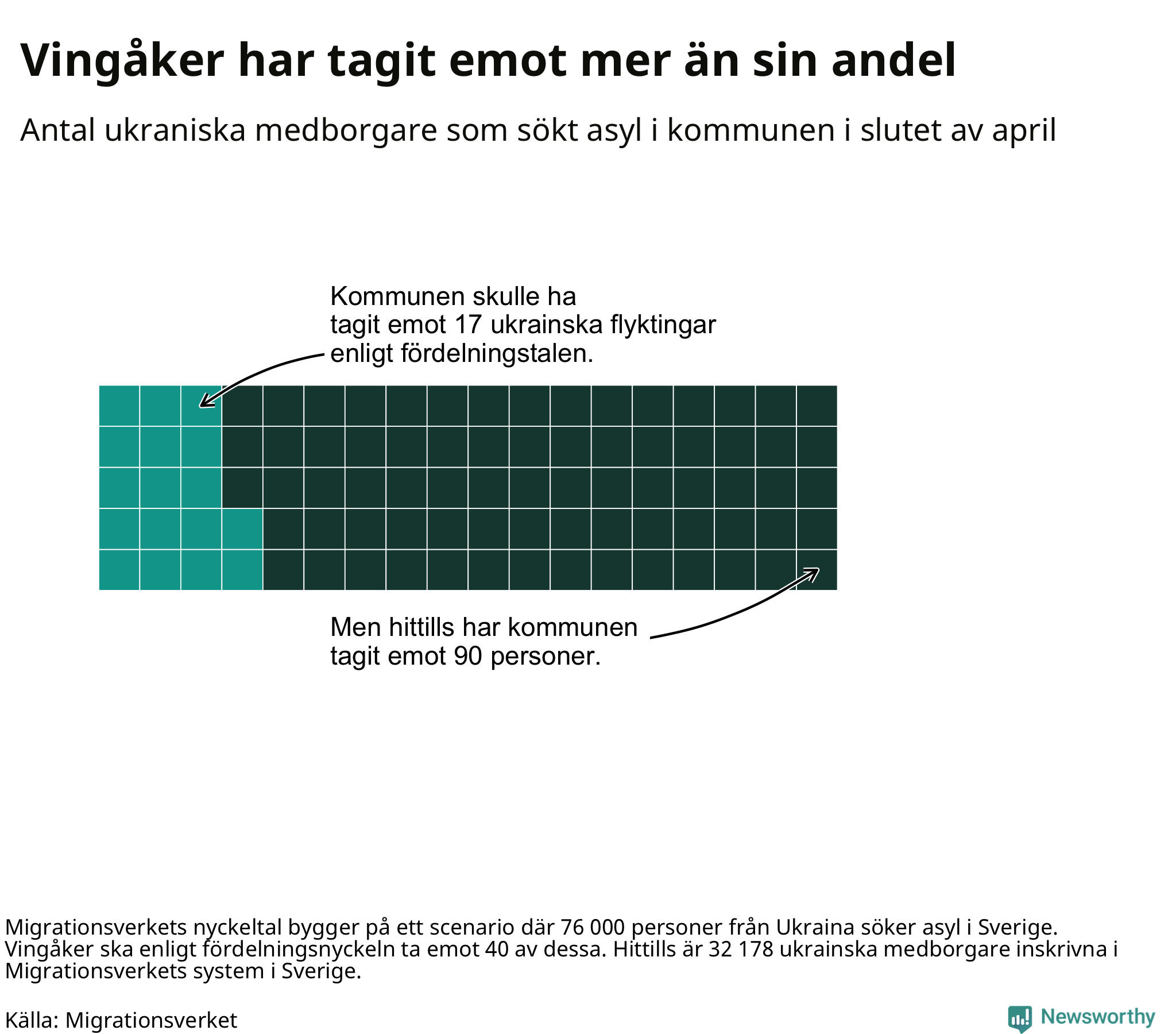 Enligt UNHCR har 5,9 miljoner människor hittills flytt från Ukraina sedan Rysslands anfall i slutet av februari. Ungefär 36 000 av dem har kommit till Sverige – och av dem som nu finns i det svenska systemet finns 90 personer i Vingåkers kommun. Det motsvarar tio ukrainska flyktingar per 1 000 invånare, vilket är näst flest i Södermanlands län. Flest i landet, sett till befolkning, har Högsby kommun tagit emot: 160 personer – eller 28 per 1 000 invånare.