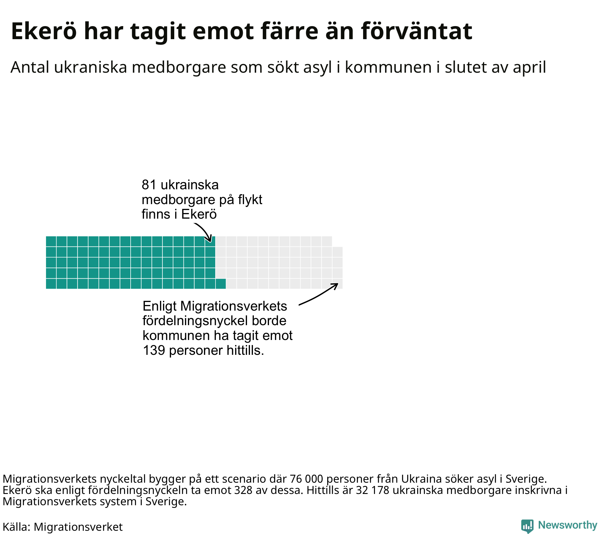 Enligt UNHCR har 5,9 miljoner människor hittills flytt från Ukraina sedan Rysslands anfall i slutet av februari. Ungefär 36 000 av dem har kommit till Sverige – och av dem som nu finns i det svenska systemet finns 81 personer i Ekerö kommun. Det motsvarar tre ukrainska flyktingar per 1 000 invånare, vilket placerar kommunen bland den tredjedel som hittills tagit emot minst ukrainska medborgare sett till befolkning. Flest i landet, sett till befolkning, har Högsby kommun tagit emot: 160 personer – eller 28 per 1 000 invånare.