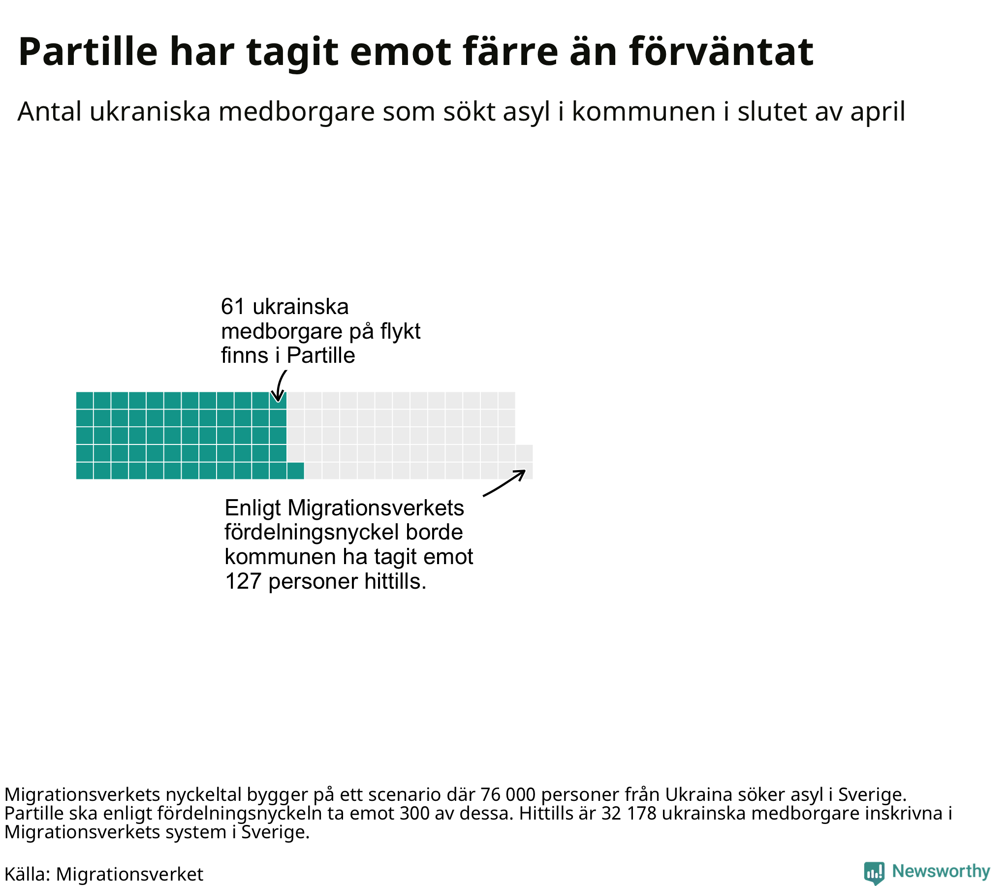 Fördelningsförslaget utgår från en tidigare prognos där 76 000 skyddssökande från Ukriana väntades under första halvåret. I den fördelningen ska Partille ta emot 300 av de 76 000. Vid samma fördelning borde Partille ha tagit emot 127 av de som anlänt hittills – kommunen har alltså tagit emot 66 färre ukrainska medborgare än förväntat.