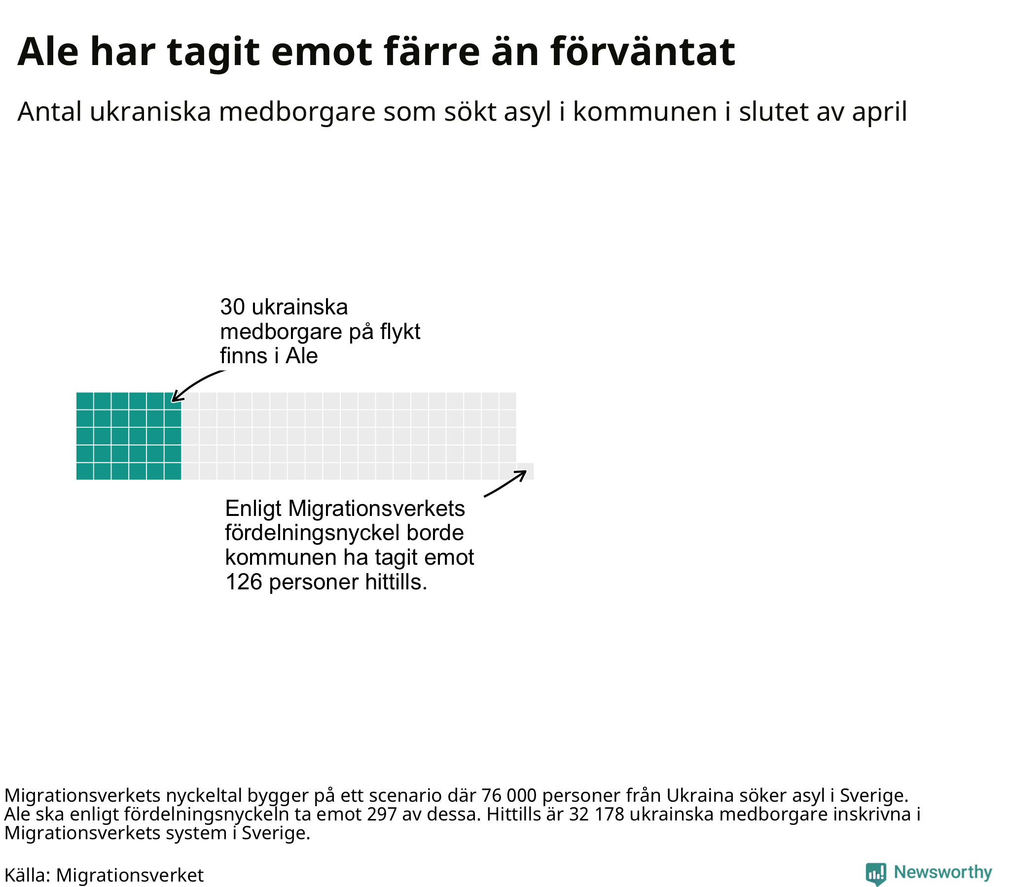 Enligt UNHCR har 5,9 miljoner människor hittills flytt från Ukraina sedan Rysslands anfall i slutet av februari. Ungefär 36 000 av dem har kommit till Sverige – och av dem som nu finns i det svenska systemet finns 30 personer i Ale kommun. Det motsvarar en ukrainsk flykting per 1 000 invånare, vilket är en ganska genomsnittlig andel. Flest i landet, sett till befolkning, har Högsby kommun tagit emot: 160 personer – eller 28 per 1 000 invånare.