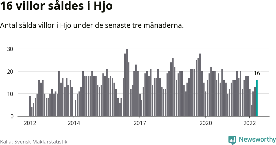 Mellan mars och maj gjordes sammanlagt 16 affärer med villor i Hjo kommun. Det är lika många affärer som vid motsvarande tid i fjol.