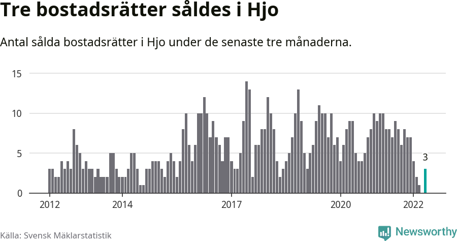 Mellan mars och maj gjordes sammanlagt tre affärer med bostadsrätter i Hjo kommun. Det kan jämföras med åtta vid motsvarande tid i fjol.