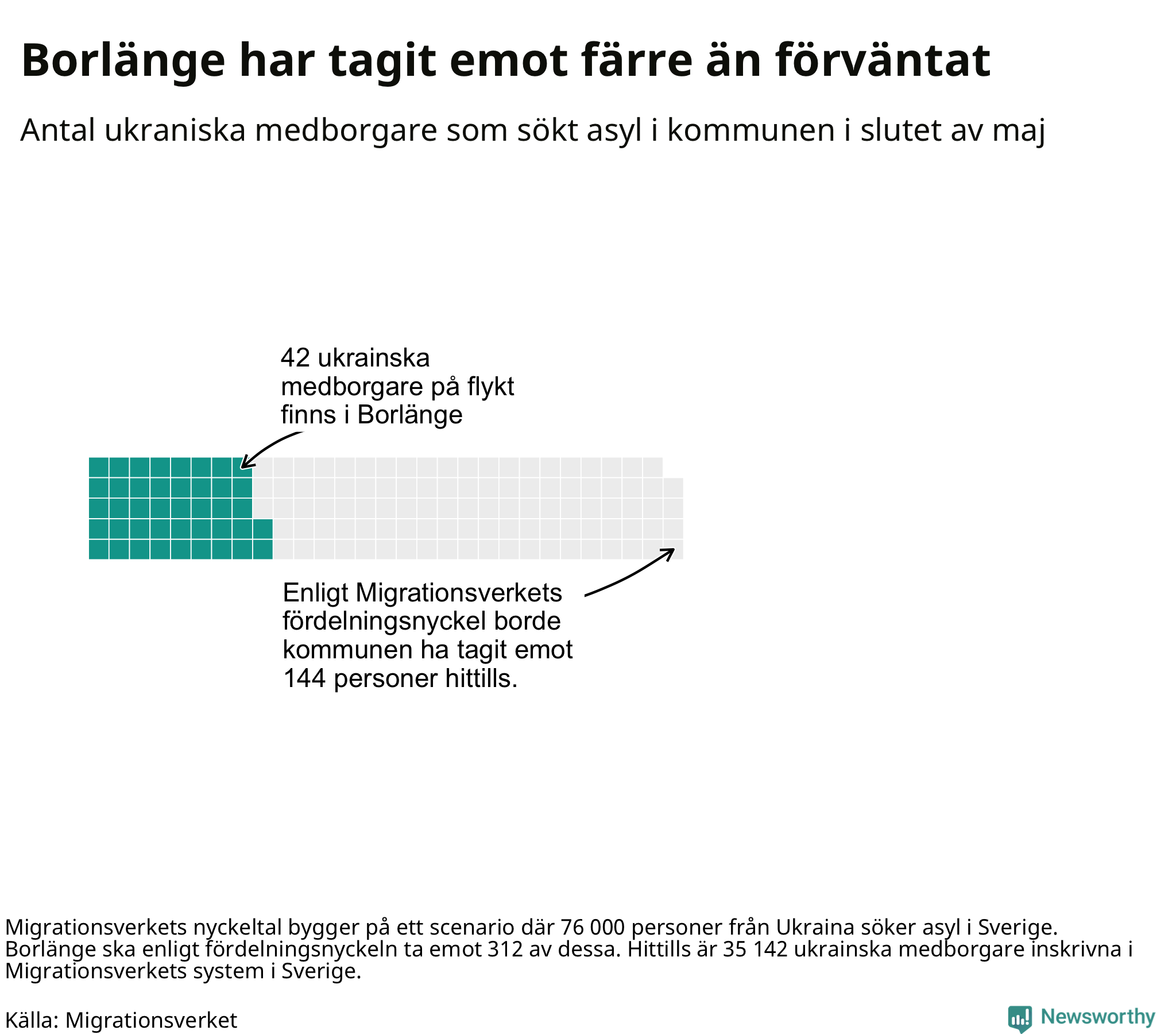 Fördelningsförslaget utgår från en tidigare prognos där 76 000 skyddssökande från Ukriana väntades under första halvåret. I den fördelningen ska Borlänge ta emot 312 av de 76 000. Vid samma fördelning borde Borlänge ha tagit emot 144 av de som anlänt hittills – kommunen har alltså tagit emot 102 färre ukrainska medborgare än förväntat.