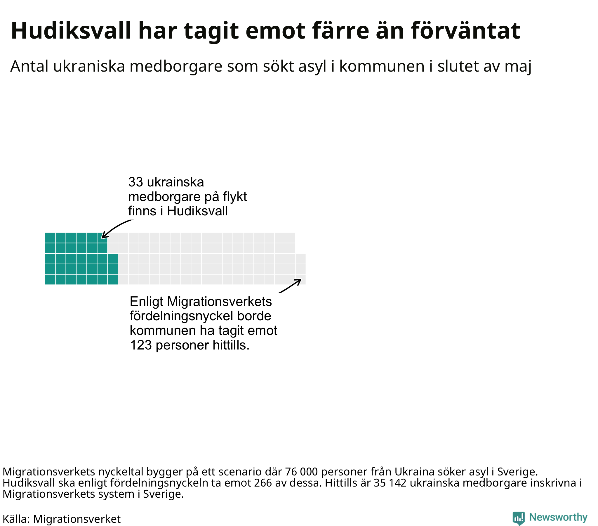 Enligt UNHCR har 7 miljoner människor hittills flytt från Ukraina sedan Rysslands anfall i slutet av februari. Ungefär 39 000 av dem har kommit till Sverige – och av dem som nu finns i det svenska systemet finns 33 personer i Hudiksvalls kommun. Det motsvarar en ukrainsk flykting per 1 000 invånare, vilket är en ganska genomsnittlig andel. Flest i landet, sett till befolkning, har Högsby kommun tagit emot: 159 personer – eller 28 per 1 000 invånare.