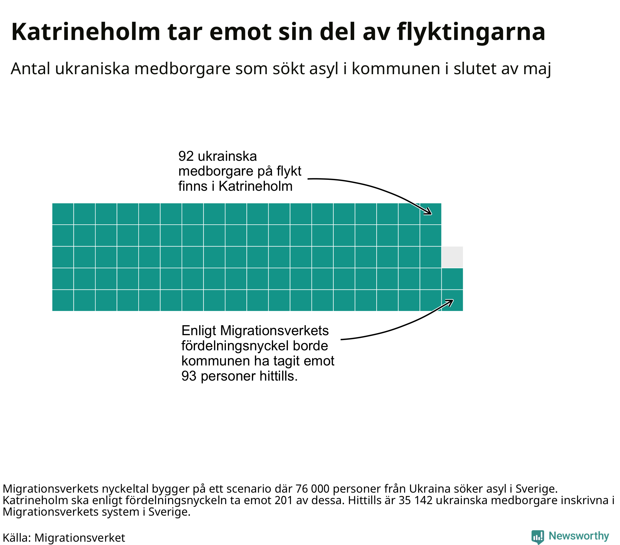 Fördelningsförslaget utgår från en tidigare prognos där 76 000 skyddssökande från Ukriana väntades under första halvåret. I den fördelningen ska Katrineholm ta emot 201 av de 76 000. Vid samma fördelning borde Katrineholm ha tagit emot 93 av de som anlänt hittills – kommunen har alltså tagit emot en färre ukrainsk medborgare än förväntat.