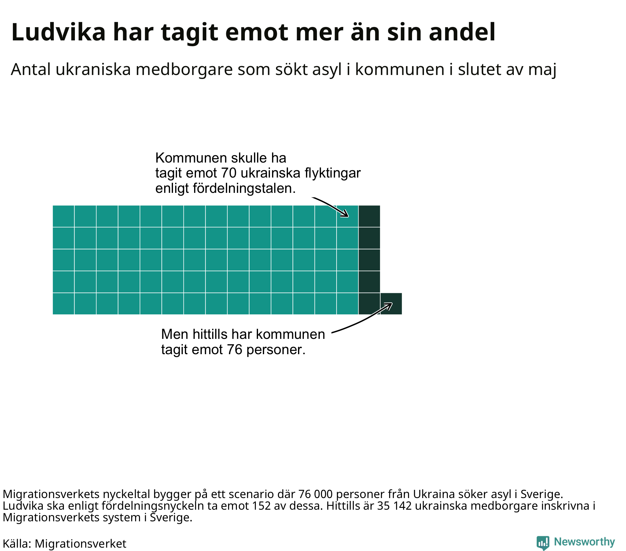 Fördelningsförslaget utgår från en tidigare prognos där 76 000 skyddssökande från Ukriana väntades under första halvåret. I den fördelningen ska Ludvika ta emot 152 av de 76 000. Vid samma fördelning borde Ludvika ha tagit emot 70 av de som anlänt hittills – kommunen har alltså tagit emot sex fler ukrainska medborgare än förväntat.