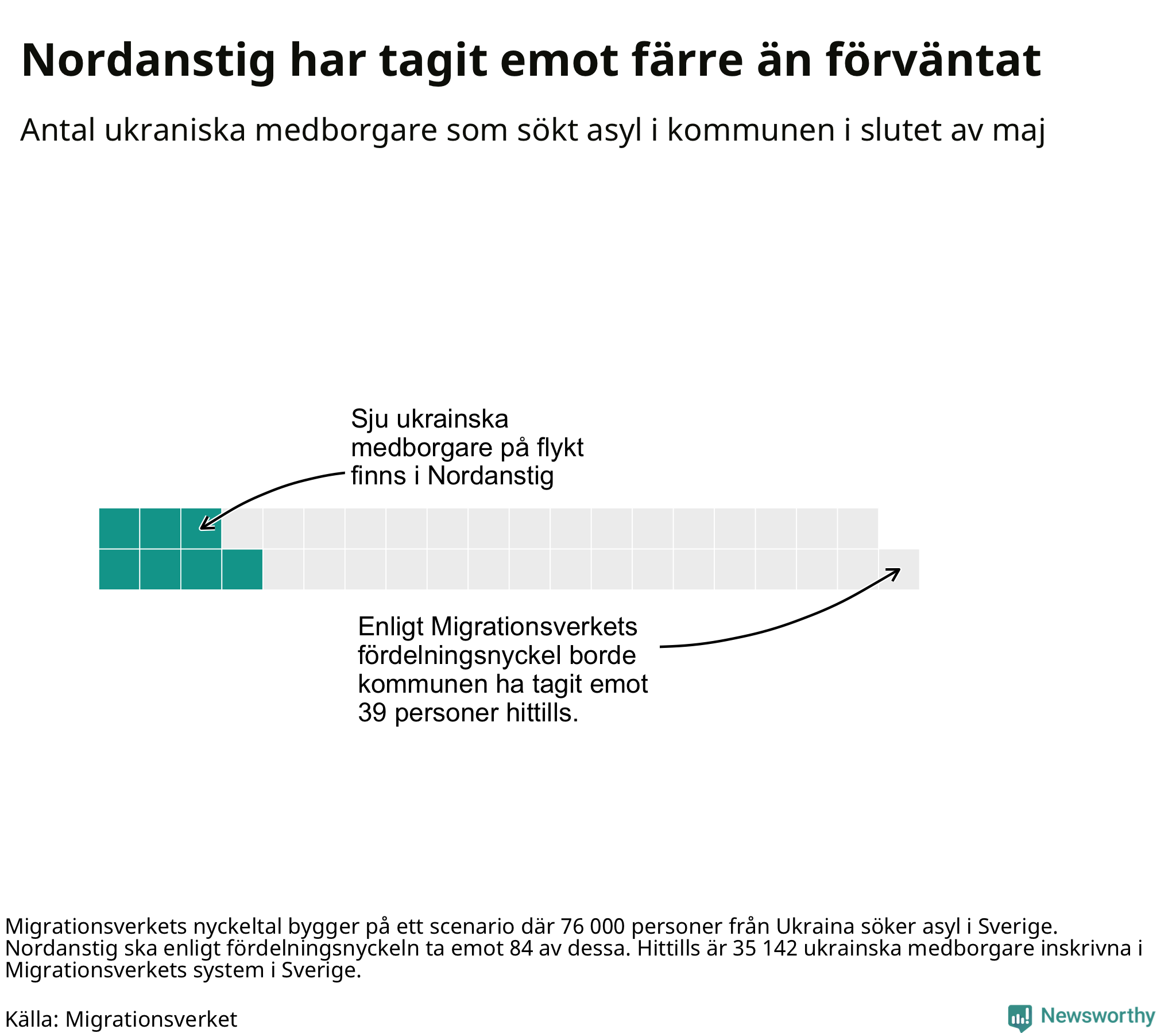Fördelningsförslaget utgår från en tidigare prognos där 76 000 skyddssökande från Ukriana väntades under första halvåret. I den fördelningen ska Nordanstig ta emot 84 av de 76 000. Vid samma fördelning borde Nordanstig ha tagit emot 39 av de som anlänt hittills – kommunen har alltså tagit emot 32 färre ukrainska medborgare än förväntat.