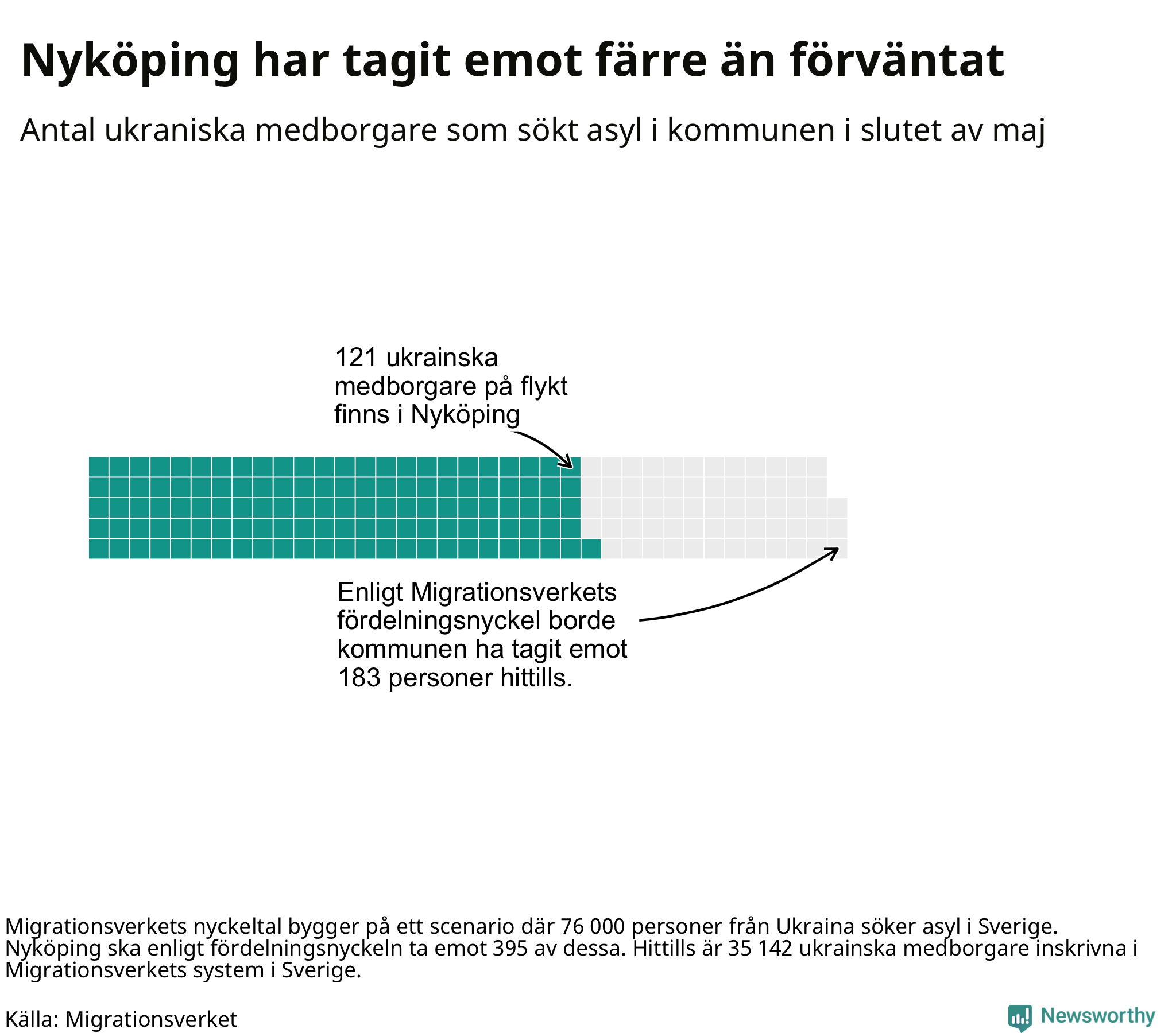 Fördelningsförslaget utgår från en tidigare prognos där 76 000 skyddssökande från Ukriana väntades under första halvåret. I den fördelningen ska Nyköping ta emot 395 av de 76 000. Vid samma fördelning borde Nyköping ha tagit emot 183 av de som anlänt hittills – kommunen har alltså tagit emot 62 färre ukrainska medborgare än förväntat.