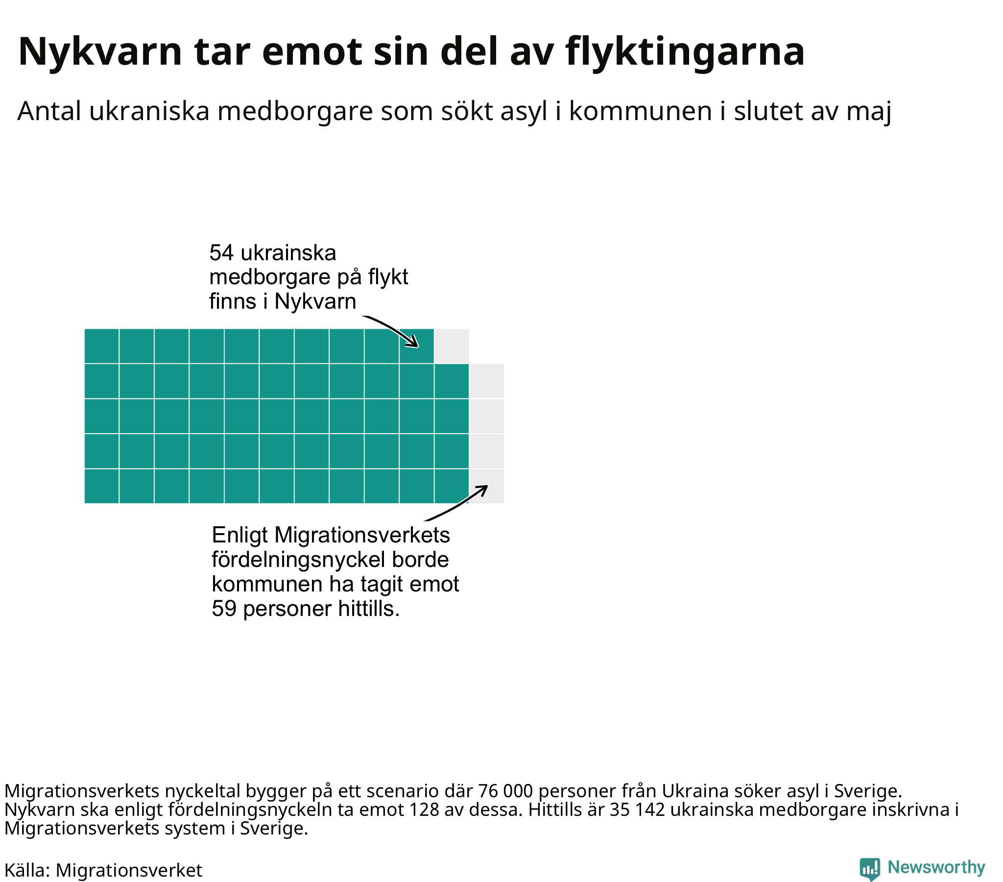 Enligt UNHCR har 7 miljoner människor hittills flytt från Ukraina sedan Rysslands anfall i slutet av februari. Ungefär 39 000 av dem har kommit till Sverige – och av dem som nu finns i det svenska systemet finns 54 personer i Nykvarns kommun. Det motsvarar fem ukrainska flyktingar per 1 000 invånare, vilket placerar kommunen bland den tredjedel som hittills tagit emot flest. Flest i landet, sett till befolkning, har Högsby kommun tagit emot: 159 personer – eller 28 per 1 000 invånare.