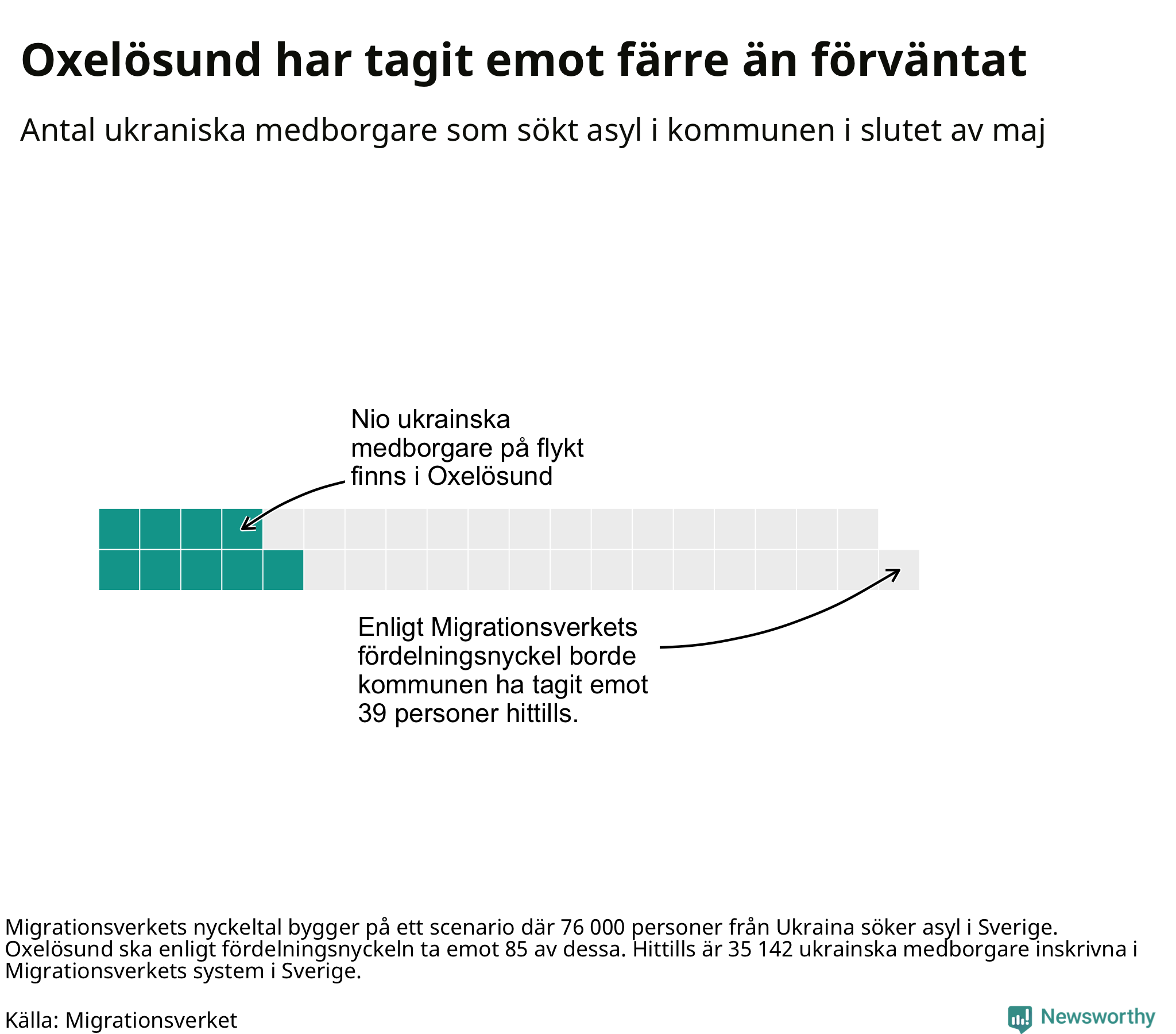 Fördelningsförslaget utgår från en tidigare prognos där 76 000 skyddssökande från Ukriana väntades under första halvåret. I den fördelningen ska Oxelösund ta emot 85 av de 76 000. Vid samma fördelning borde Oxelösund ha tagit emot 39 av de som anlänt hittills – kommunen har alltså tagit emot 30 färre ukrainska medborgare än förväntat.