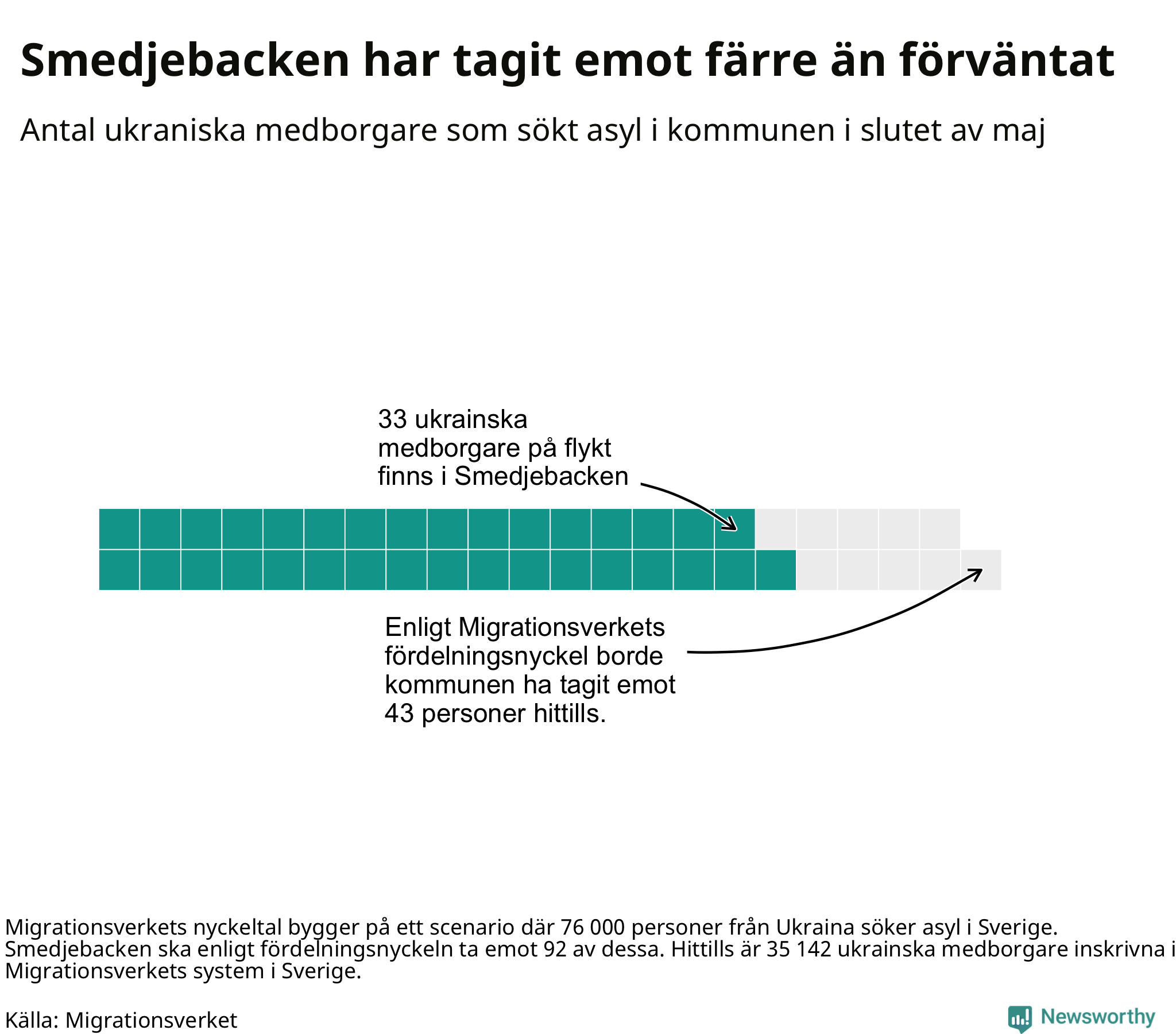 Fördelningsförslaget utgår från en tidigare prognos där 76 000 skyddssökande från Ukriana väntades under första halvåret. I den fördelningen ska Smedjebacken ta emot 92 av de 76 000. Vid samma fördelning borde Smedjebacken ha tagit emot 43 av de som anlänt hittills – kommunen har alltså tagit emot tio färre ukrainska medborgare än förväntat.