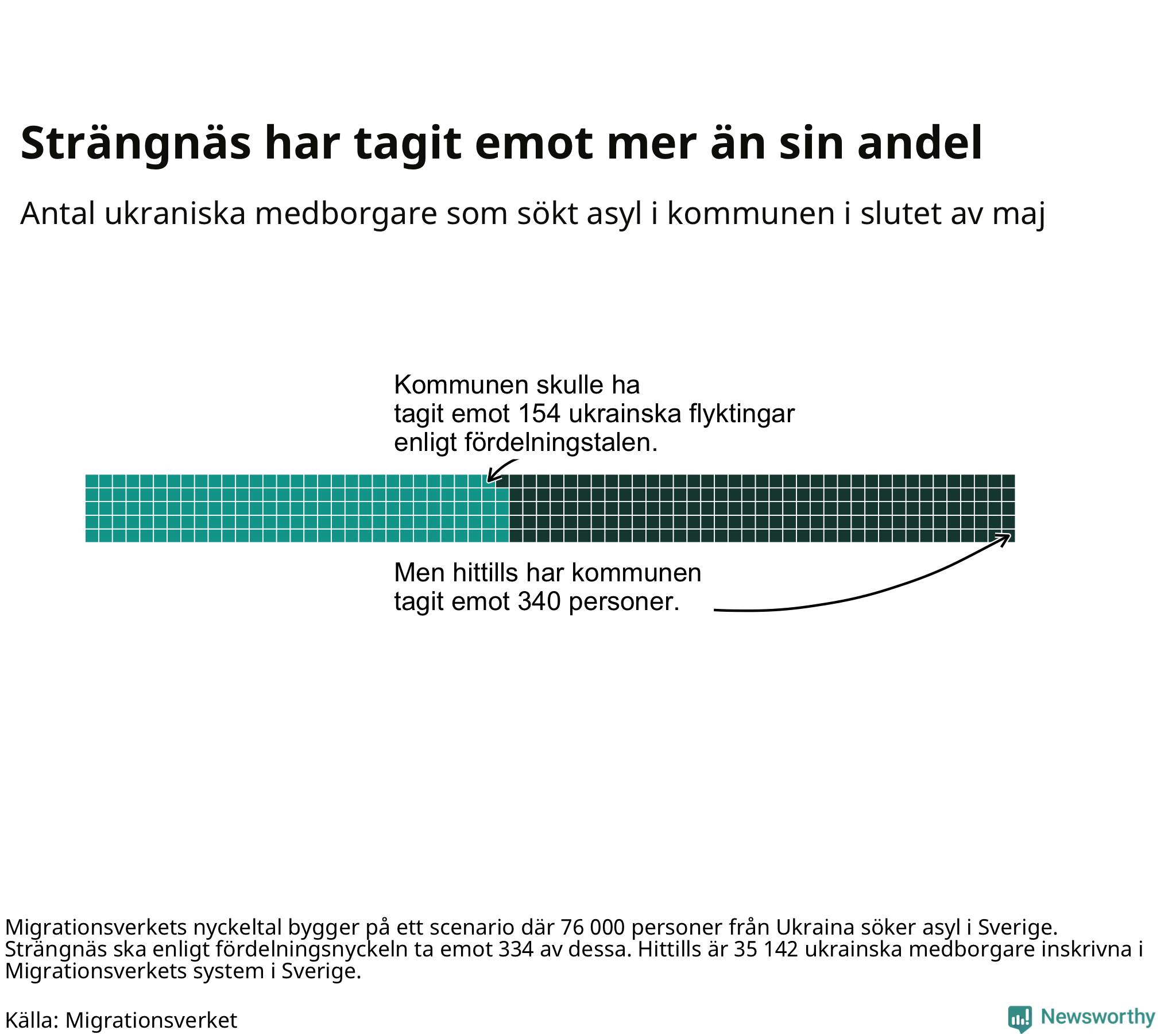 Fördelningsförslaget utgår från en tidigare prognos där 76 000 skyddssökande från Ukriana väntades under första halvåret. I den fördelningen ska Strängnäs ta emot 334 av de 76 000. Vid samma fördelning borde Strängnäs ha tagit emot 154 av de som anlänt hittills – kommunen har alltså tagit emot 186 fler ukrainska medborgare än förväntat.