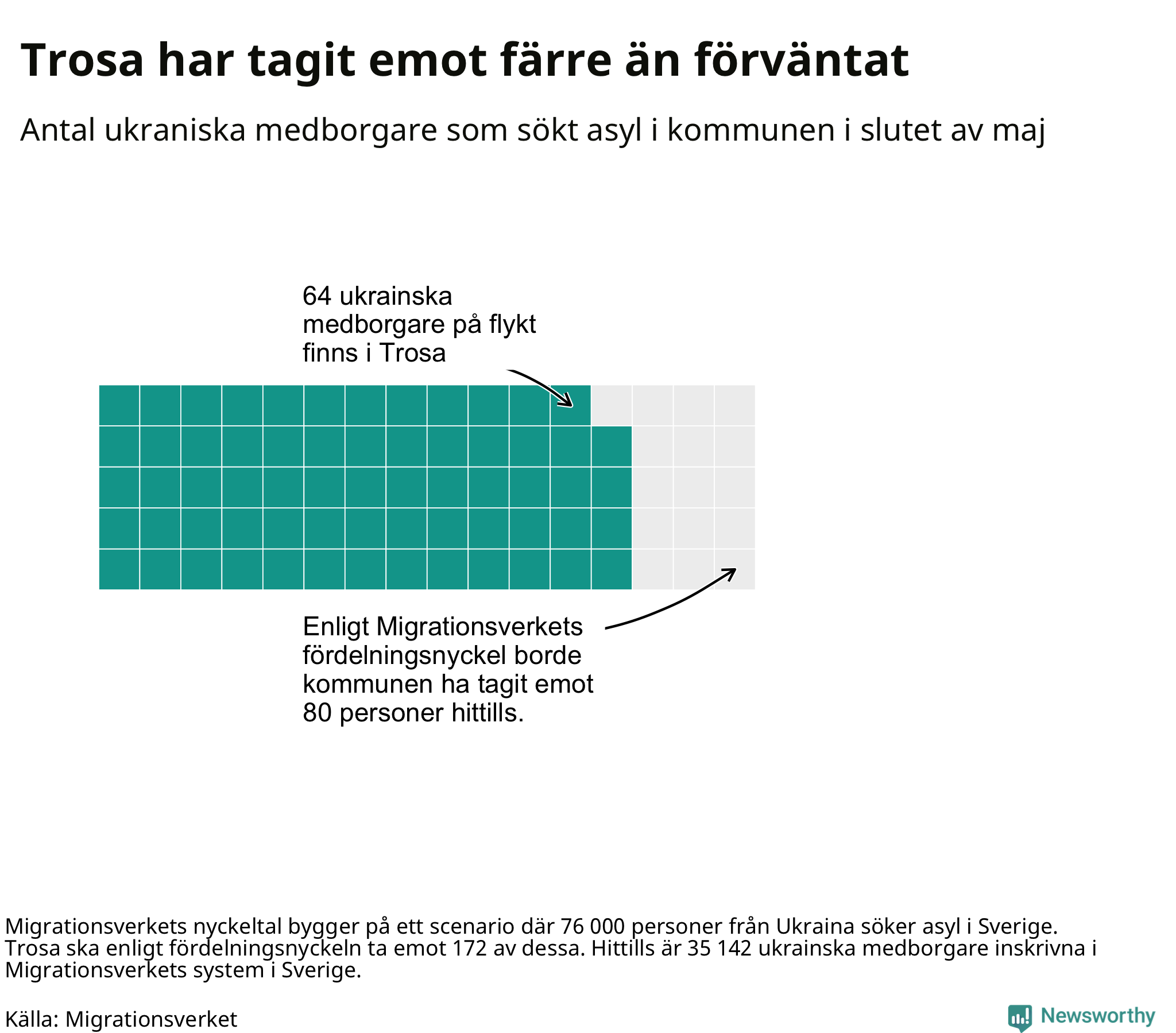 Fördelningsförslaget utgår från en tidigare prognos där 76 000 skyddssökande från Ukriana väntades under första halvåret. I den fördelningen ska Trosa ta emot 172 av de 76 000. Vid samma fördelning borde Trosa ha tagit emot 80 av de som anlänt hittills – kommunen har alltså tagit emot 16 färre ukrainska medborgare än förväntat.