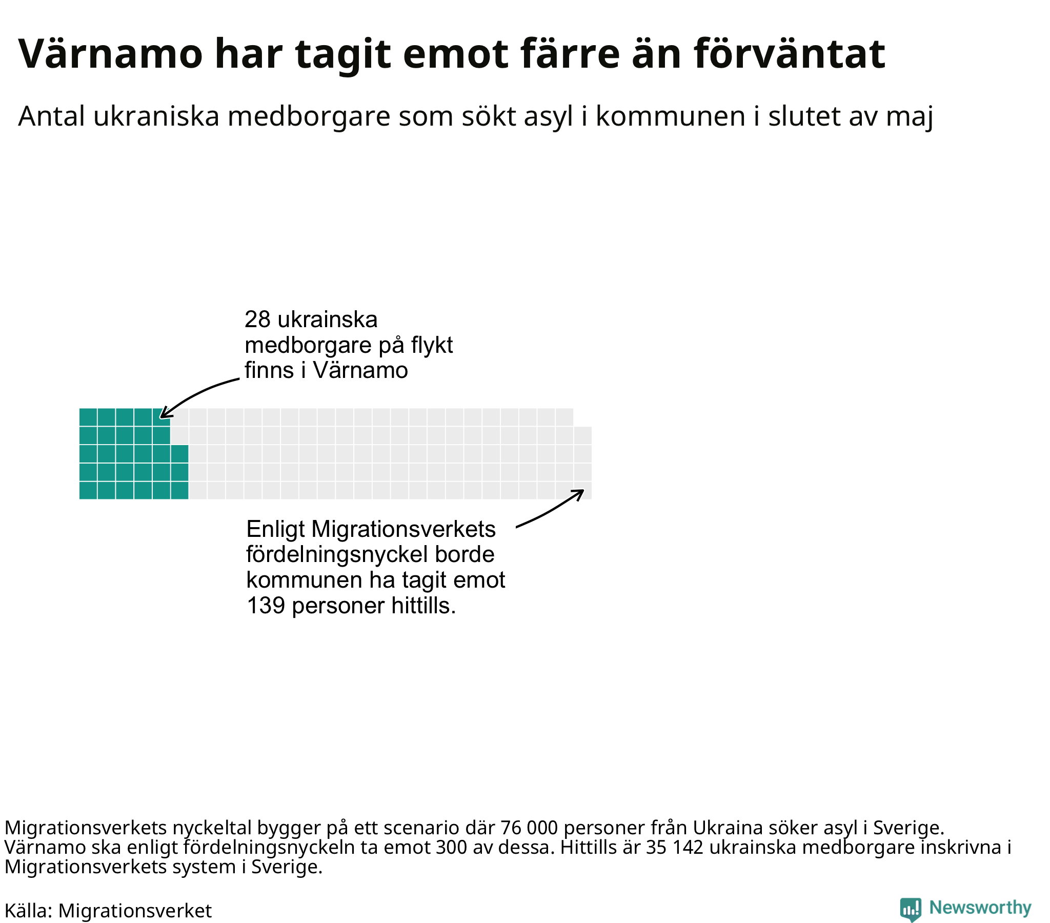 Enligt UNHCR har 7 miljoner människor hittills flytt från Ukraina sedan Rysslands anfall i slutet av februari. Ungefär 39 000 av dem har kommit till Sverige – och av dem som nu finns i det svenska systemet finns 28 personer i Värnamo kommun. Det motsvarar en ukrainsk flykting per 1 000 invånare, vilket är en ganska genomsnittlig andel. Flest i landet, sett till befolkning, har Högsby kommun tagit emot: 159 personer – eller 28 per 1 000 invånare.