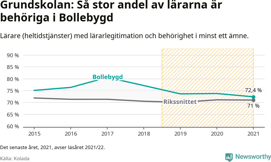 Under det senaste läsåret hade 72 procent av grundskollärarna i Bollebygd lärarlegitimation och behörighet i minst ett ämne. Det är en lägre andel än 2018, då 77 procent var behöriga i minst ett ämne.