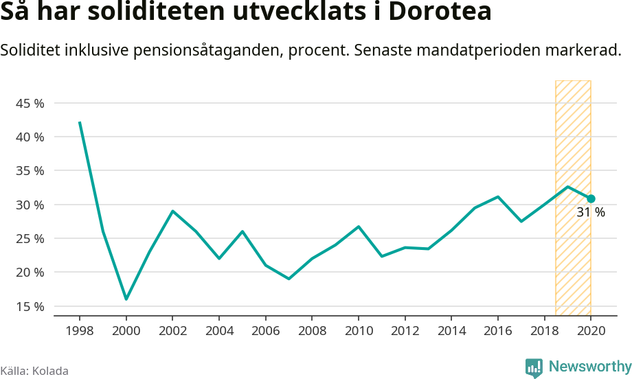 Dorotea kommun hade år 2020 (kommunen saknar data för 2021 i databasen Kolada) i stort sett samma soliditet som i slutet på förra mandatperioden (30,8 procent).