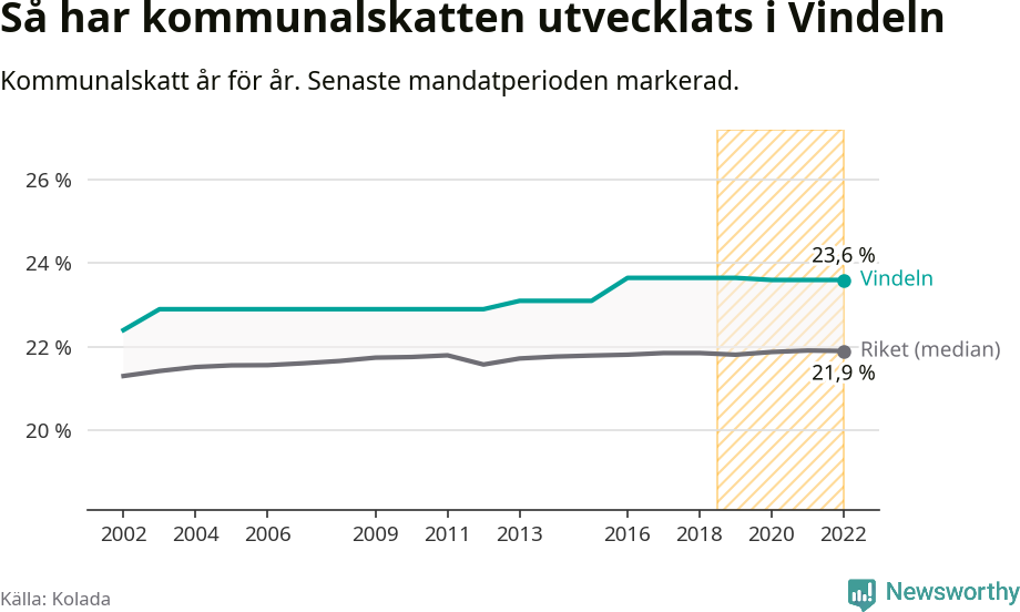 Den kommunala skattesatsen i Vindeln ligger i dag på 23,60 procent, vilket är lägre än i slutet på förra mandatperioden (23,65 procent). Vindeln är därmed en av 62 kommuner som avslutar mandatperioden med lägre skattesats än 2018. De allra flesta kommunerna har samma skattesats i dag som i slutet av den förra mandatperioden.