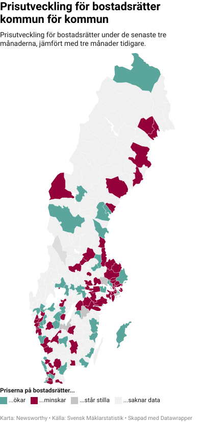 Priserna på bostadsrätter sjunker i 72 av landets kommuner, medan de stiger i 46 (i merparten av de resterande kommunerna redovisas inga prisförändringsuppgifter på grund av få försäljningar). Nedanstående karta visar den geografiska spridningen.