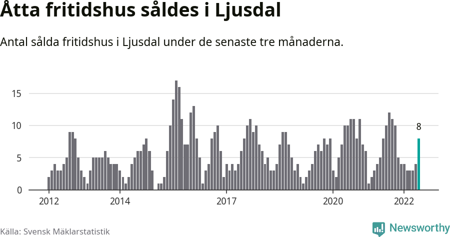 Mellan april och juni gjordes sammanlagt åtta affärer med fritidshus i Ljusdals kommun. Det är lika många affärer som vid motsvarande tid i fjol.