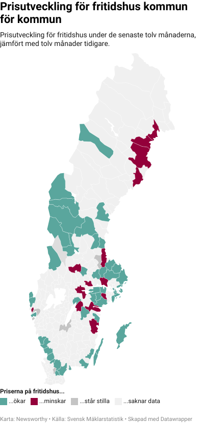 Priserna på fritidshus stiger i 48 av landets kommuner, medan de sjunker i 14 (i merparten av de resterande kommunerna redovisas inga prisförändringsuppgifter på grund av få försäljningar). Kartan nedan visar den geografiska spridningen.