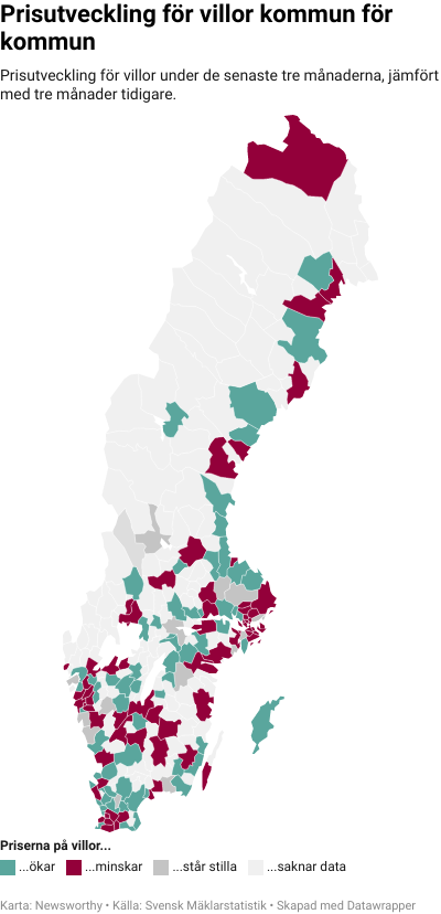 Priserna på villor sjunker i 70 av landets kommuner, medan de stiger i 66 (i merparten av de resterande kommunerna redovisas inga prisförändringsuppgifter på grund av få försäljningar). Kartan nedan visar den geografiska spridningen.