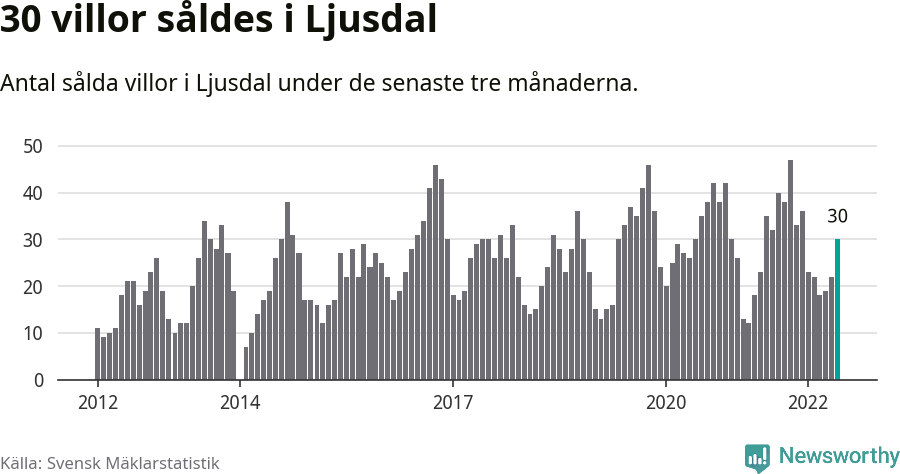 Mellan april och juni gjordes sammanlagt 30 affärer med villor i Ljusdals kommun. Det kan jämföras med 35 vid motsvarande tid i fjol.