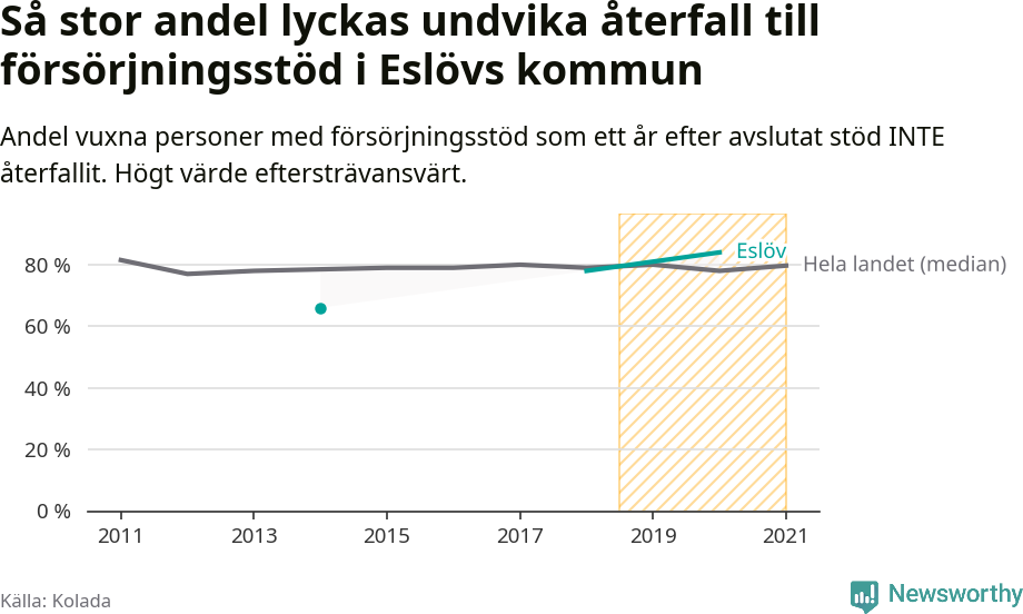 Andelen vuxna biståndstagare som inte har behövt bistånd på nytt inom ett år var ungefär lika högt den här mandatperioden som den förra. Här är alltså ett högt tal bra, och ett lågt tal dåligt, och i Eslövs kommun var andelen i genomsnitt 82,5 procent2 under under innevarande mandatperiod, att jämföra med i genomsnitt 78 procent3 under den förra.