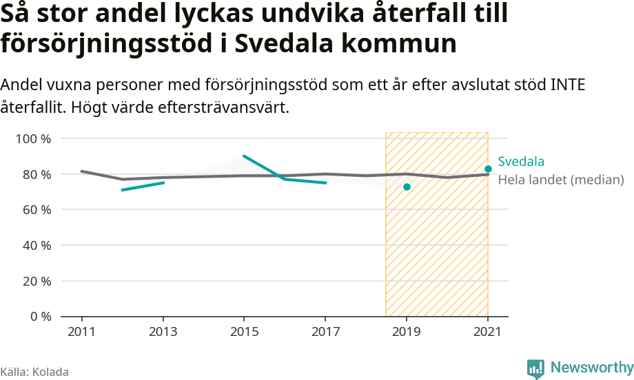 Graf: Andel vuxna personer med försörjningsstöd i Svedala kommun som ett år efter avslutat stöd INTE återfallit