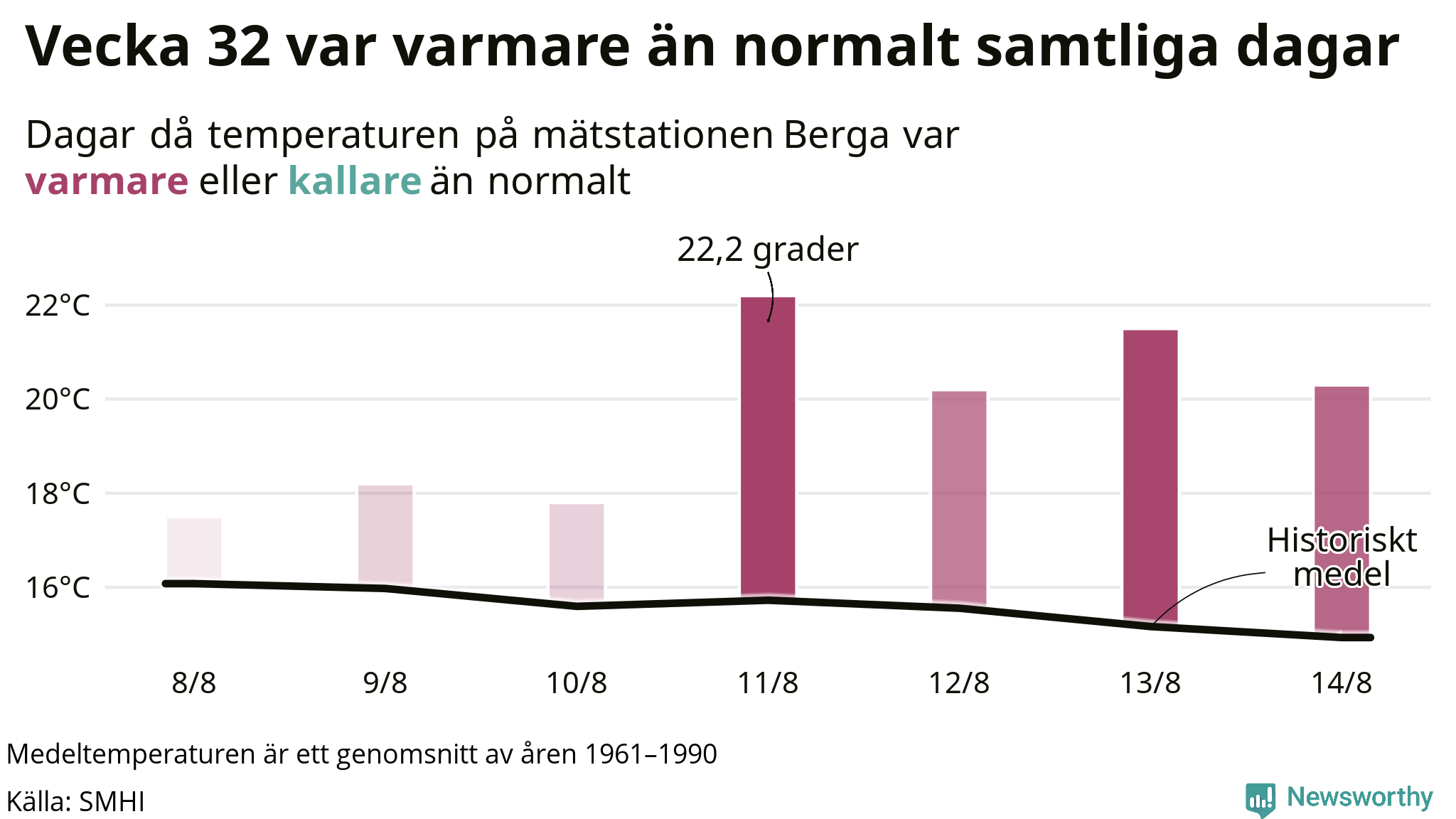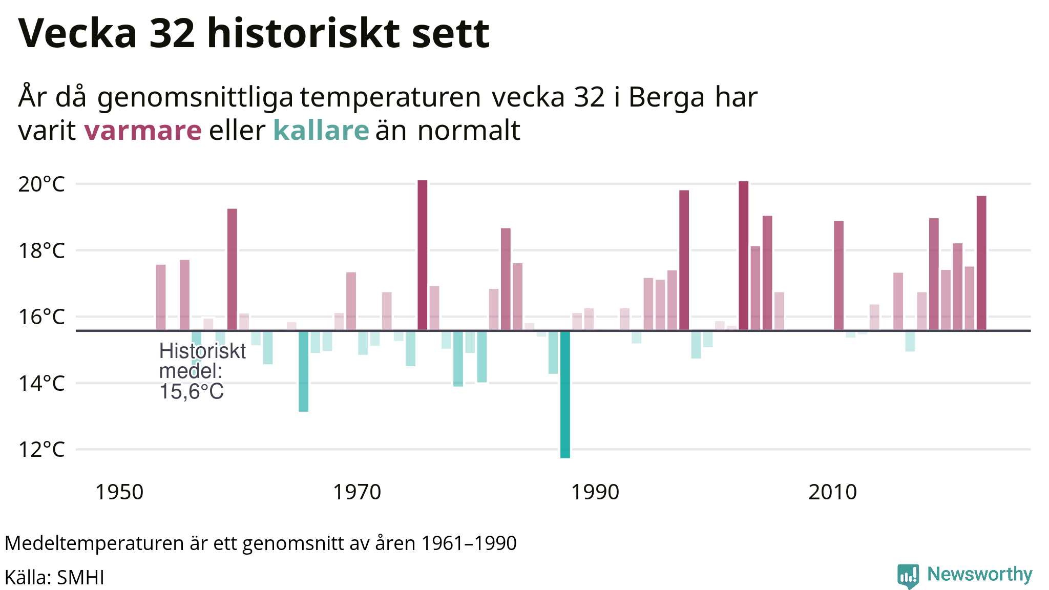 Med klimatförändringen kan vi förvänta oss gradvis varmare temperaturer. Under det senaste decenniet har vecka 32 varit varmare än snittet åtta av tio år vid Berga.