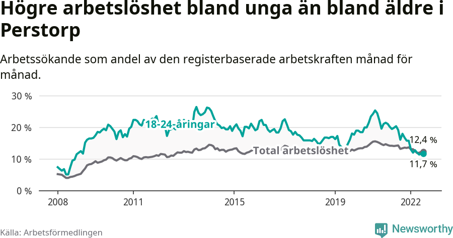 Precis som den totala arbetslösheten ligger ungdomsarbetslösheten i Perstorp högre än i Skåne som helhet. Skillnaden mellan kommunen och länet är 1,5 procentenheter.