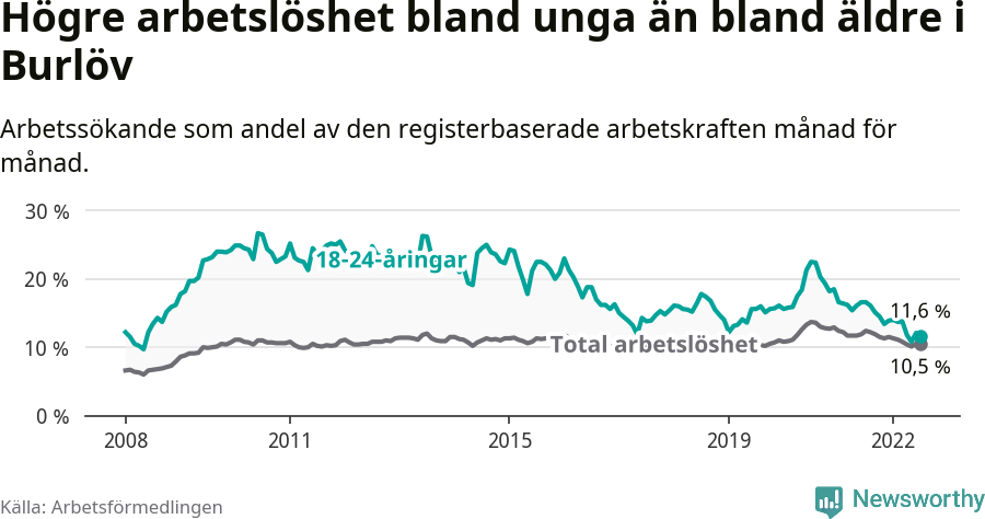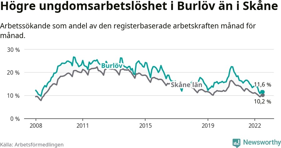 Precis som den totala arbetslösheten ligger ungdomsarbetslösheten i Burlöv högre än i Skåne som helhet. Skillnaden mellan kommunen och länet är 1,4 procentenheter.