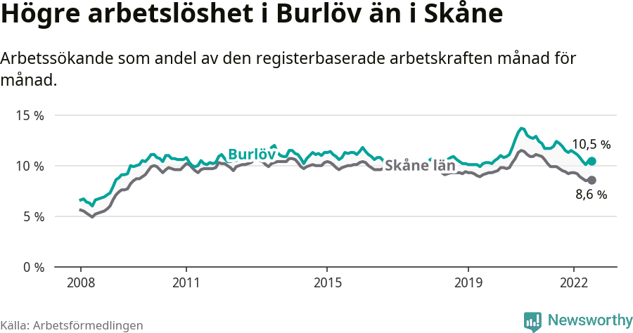 Det är 16:e månaden i följd som arbetslösheten i Burlöv är lägre än den var under samma tidpunkt året innan. Sedan mars 2021 har arbetslösheten gått ner från 11,7 till 10,5 procent.