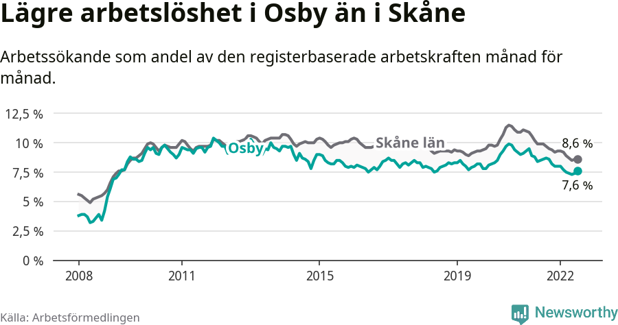 Det är 16:e månaden i följd som arbetslösheten i Osby är lägre än den var under samma tidpunkt året innan. Sedan mars 2021 har arbetslösheten gått ner från 8,9 till 7,6 procent.