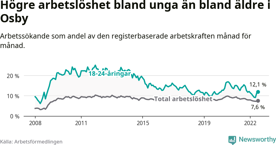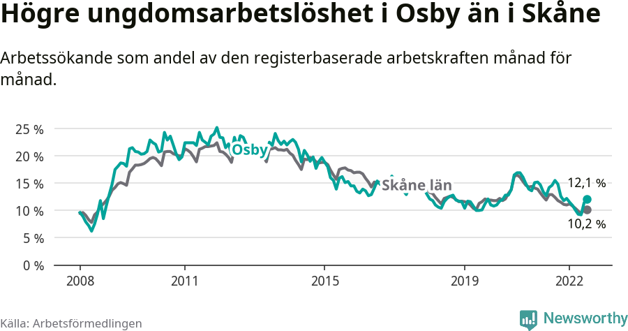 Medan Osby har lägre total arbetslöshet än Skåne, ligger ungdomsarbetslösheten 1,9 procentenheter högre i Osby.