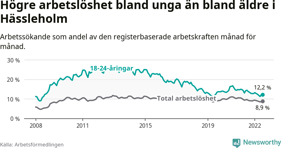 Precis som den totala arbetslösheten ligger ungdomsarbetslösheten i Hässleholm högre än i Skåne som helhet. Skillnaden mellan kommunen och länet är 2,0 procentenheter.