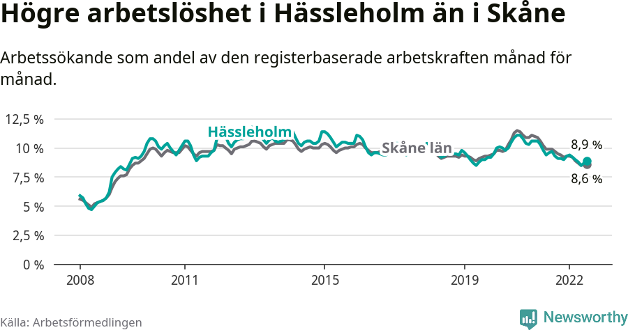 Det är 16:e månaden i följd som arbetslösheten i Hässleholm är lägre än den var under samma tidpunkt året innan. Sedan mars 2021 har arbetslösheten gått ner från 10,3 till 8,9 procent.