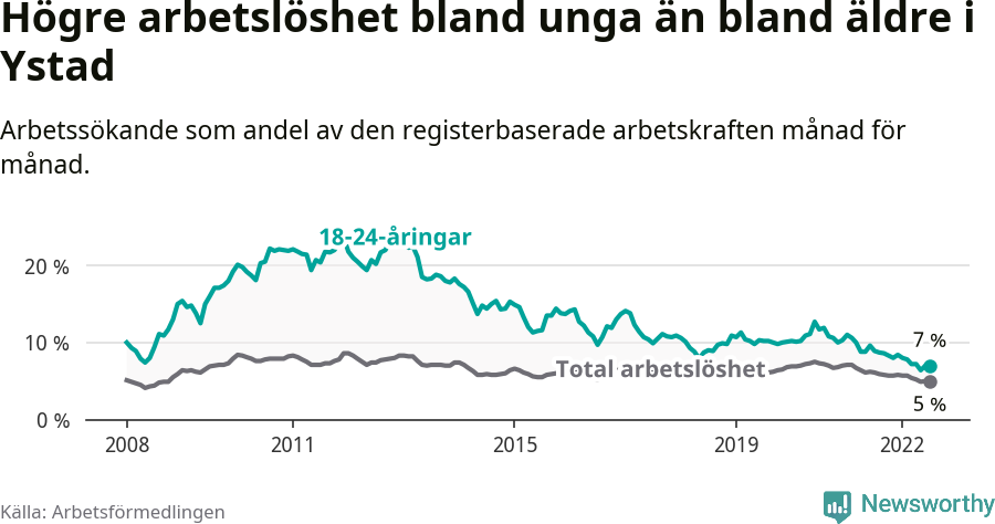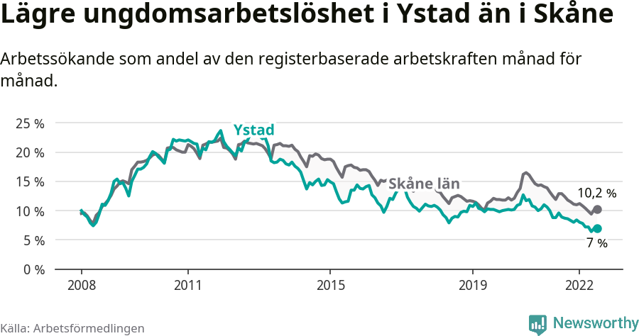 Precis som den totala arbetslösheten ligger ungdomsarbetslösheten i Ystad lägre än i Skåne som helhet. Skillnaden mellan kommunen och länet är 3,2 procentenheter.