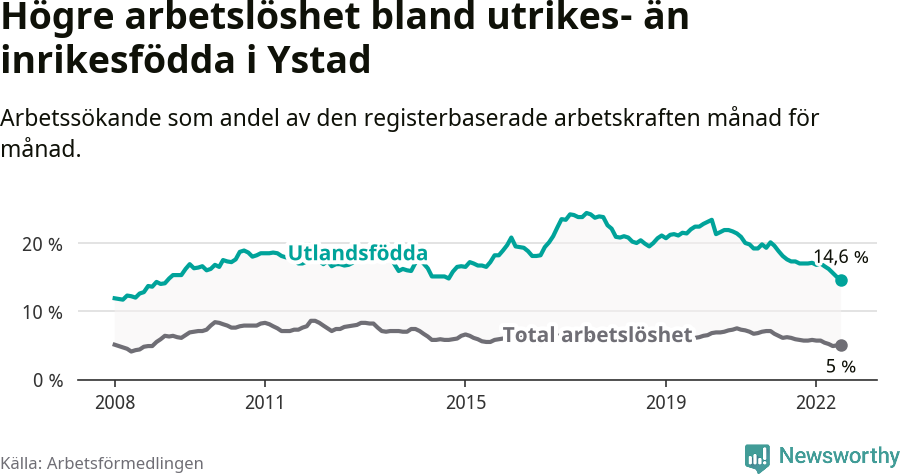 Arbetslösheten bland utlandsfödda var 14,6 procent i Ystad under juli månad, motsvarande 255 av 1 747 personer. Det är 2,7 procentenheter färre än vid samma tidpunkt i fjol (−44 om man räknar personer). Därmed har de utlandsföddas arbetslöshet varit lägre än vid samma tidpunkt i fjol i över två år i sträck. Sedan juni 2020 har arbetslösheten bland utlandsfödda minskat från 21,4 till 14,6 procent. Den nuvarande arbetslöshetsnivån är den lägsta sedan januari 2009.